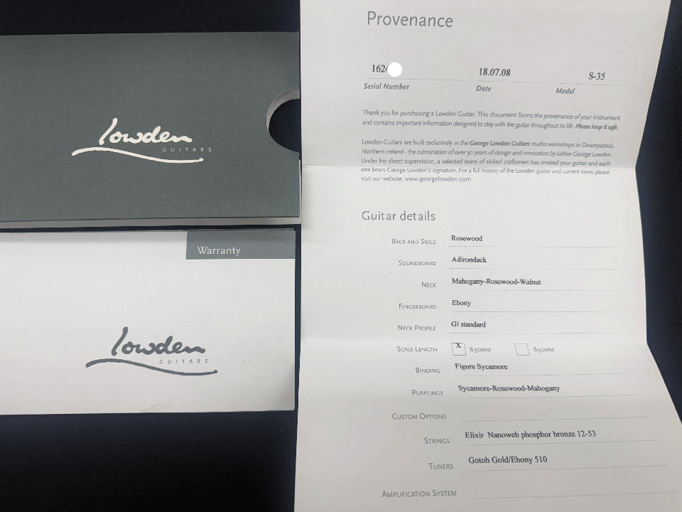 状態はワンオーナー品で大切に使用されており使用感も少なく僅かにペグのゴールドメッキの僅かな曇りは有りますがチューニングはとてもスムーズです。塗装も極薄のマットフィニシュですが目立つダメージも見受けられず新品同様のコンディションを保った極上品です。ネック裏も綺麗で演奏性も良く、ナットは新たに牛骨にて交換済みでフレットも9分目程度は残っており、ボディーエッジも綺麗で気になる打痕も見受けられず、透明のクリアーピックガーガードにもスクラッチ傷は殆ど見られずコンディションの良い極上品です。またヒールのピン打やピックアップの取付はありません。弦長約630mm、ナット幅約45mm、弦高は12F6弦約2.3mm、1弦約1.6mm、サドルの余裕も2.5mm程度有り、反りや元起も見受けられず、トラスロッドの余裕も有りネックを含めプレヤビリティも良好です。オリジナルハードケース、ご購入当時のワランティー、スペックシートも付属しています。Lowden独自の唯一無二のサウンドと堪らなく愛着の湧く可愛いデザイン。コンディション良し、サウンド良しのワンオーナー品です。是非この機会にお試しを頂ければ幸いです。