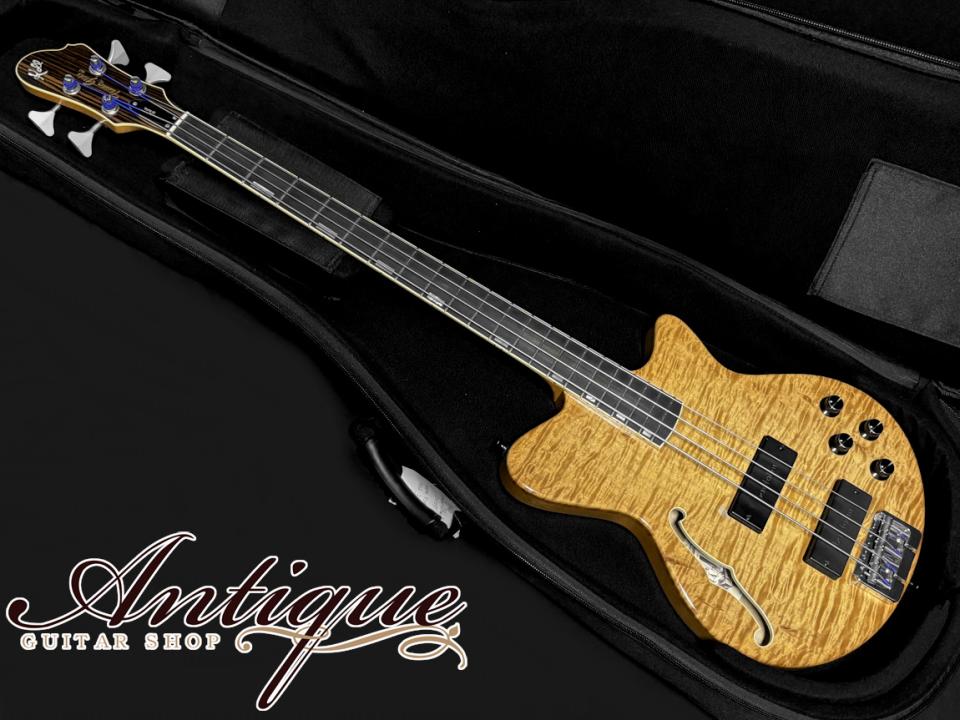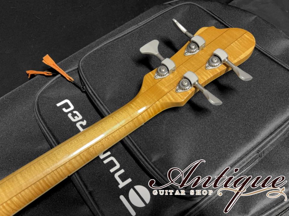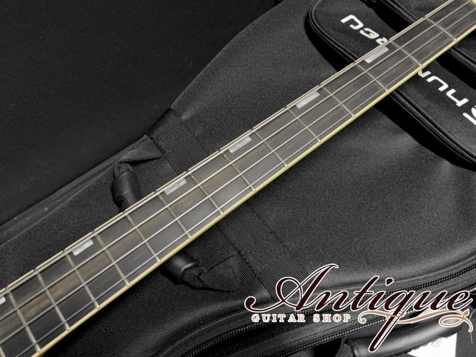 カタログラインナップ以前、エレキベースモデル自体が1986年~2018年までの32年間で20本しか製作されていなかった事もあり、そもそもの市場流通が殆どなく、更に今回の一本に関しては、そのカタログにすらラインナップされていないモデルをベースとし、セミホロウ&アクティブのウルトラレア仕様。ここ数か月直近の販売歴にて、エレキギターのFホール仕様、ベタ塗りボディのDuo Glideモデル(2013年製)が約64万円にて販売、ソリッドのベタ塗りBigsby仕様のDuo Glideモデル(2016年製)が約67万円にて販売されていた履歴が確認出来ます。またこちらの個体そのものが2年前に約76万円にて販売されていた履歴が残っており、昨今の高騰を加味すれば、現在の適正価格は80~90万円前後になるかと予想されますが、今回前所有者様からの多大なるご厚意もあり、前回販売されていた金額の半値にも迫る、まさかの破格特価にてご案内させて頂く事となりました。おそらく現在では同内容でのオーダーすら難しいと思われますが、仮にオーダー出来たとしても価格は3桁前後になるかと予想される、ハイエンドスペックな特別な一本となっておりますので、お気になりました方は絶対にこのチャンスをお見逃しなく。