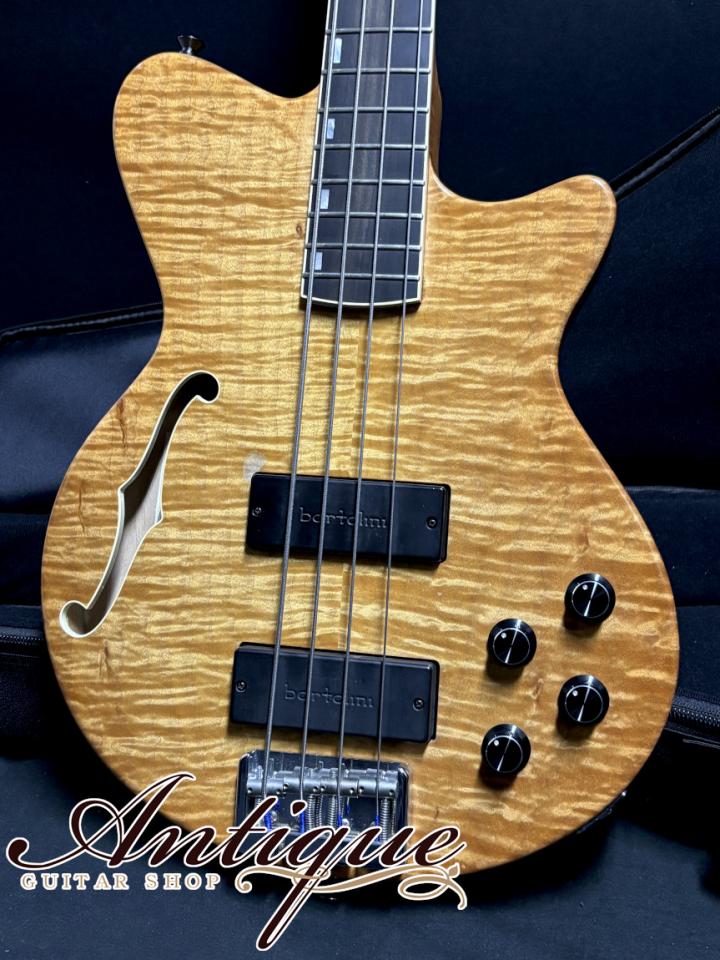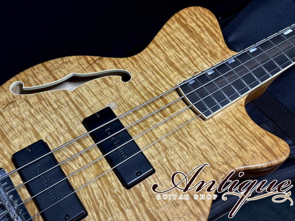 そしてその気になるサウンドですが、流石カスタムオーダー品と頷ける、他とは完全に一線を画したハイエンドサウンドを感じさせてくれます。ピックアップにはBartolini×2を搭載し、輪郭のはっきりした立ち上がりを持ちながらも、耳に痛くなりすぎない滑らかなトーン。ローエンドは膨らみすぎず、必要な太さを保ちながらタイトにまとまり、中低域にはしっかりとした密度感、高域には上品な抜け感が感じられます。またセミホロウ構造とする事で自然なエアー感や奥行き、ソリッドでは実現できない柔らかく立体的なニュアンスを持ちます。フィンガーピッキングでは程良い分離感と優しく甘いトーンを、ピッキングでは力強いアタック感と芯の強さを併せ持ち、バンドアンサンブルの中でも埋もれない主張は、ジャズやブルースはもちろん、ポップス、ロック系とジャンルを選ばない汎用性の高さが感じられます。コントロールは各PUのボリュームとトレブル&ベースのAguilar OPB-3プリアンプを搭載し、シンプルレイアウトながらに、直感的に使えるフレキシブルなサウンドメイクを可能とします。