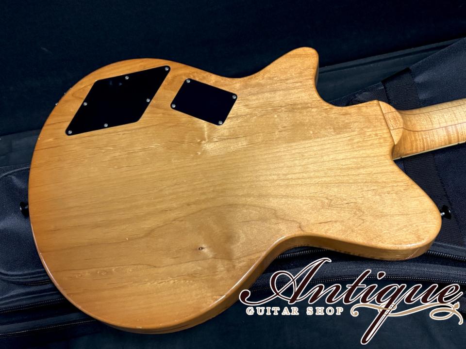 最後に状態としては、全体的に打痕やスレ、スクラッチ、一部塗装剥がれもあり、実戦的なサウンドの良い個体という事を裏付けるべく、年式相応の使用感が見受けられます。とは言えボロボロというイメージではなく、強烈なフィギュアドとカラーも相まって、美しい芸術的な一本という第一印象をお受け取り頂けるかと思います。演奏面としてはネックコンディションは良好でトラスロッドの余裕もシッカリと残っており、もちろん電装関係の不具合もございません。付属のケースは持ち運びに適した汎用のギグバッグが付属致します。
