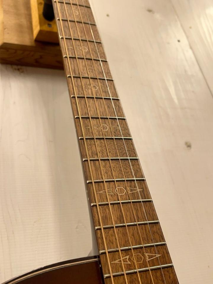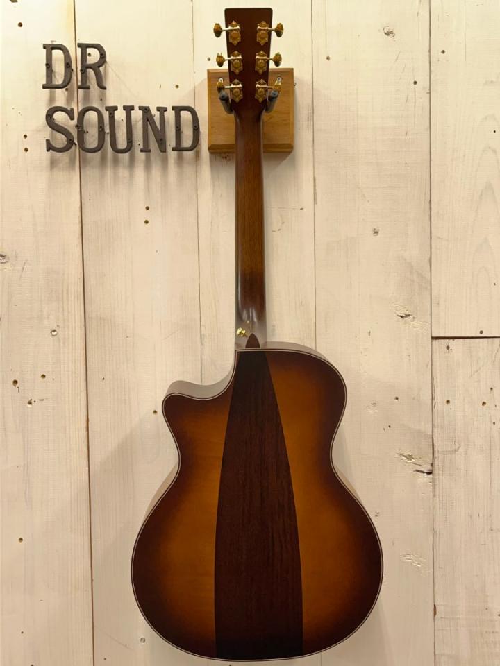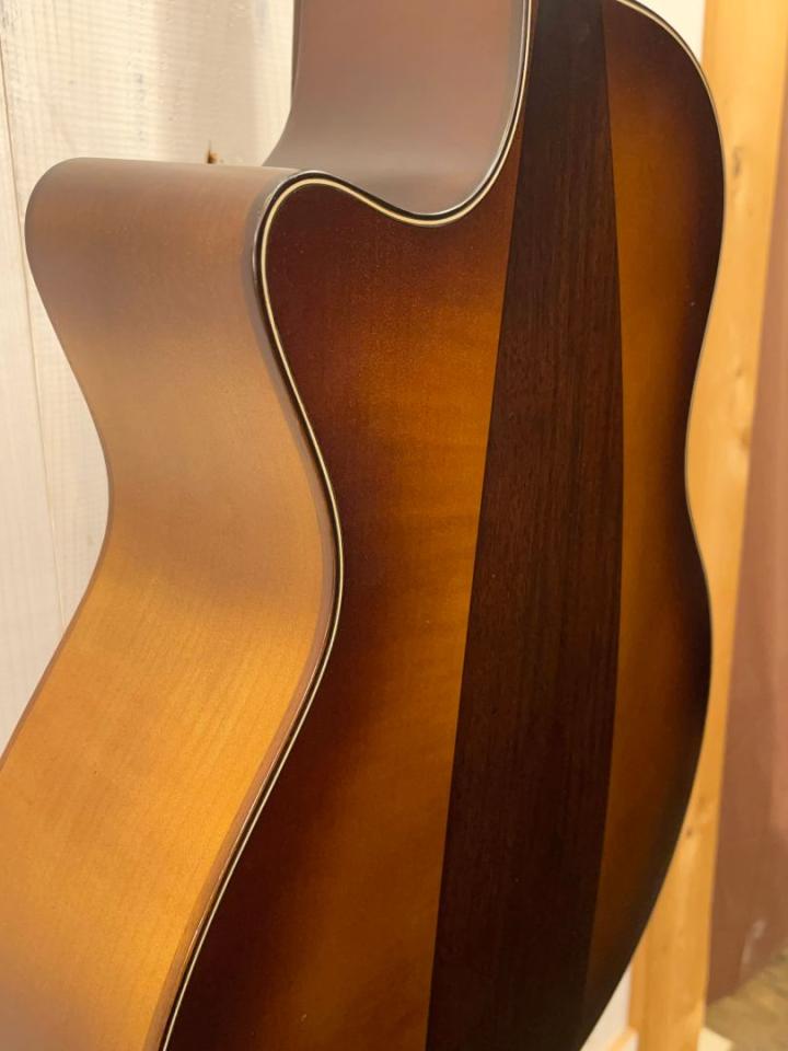 トップにはFSCR認証のヨーロピアンスプルース、サイドにはメイプル、バックにはメイプルとブラックウォールナットを用いた特徴的なデザインの3ピースバックの材構成。このモデル最大の特徴である最新のテクノロジーとして採用されたスケルトナイズド・スキャロップド・ブレーシングとボディ内部のソニック・チャンネルによってサステナブル・トーンウッドが持つ素晴らしいサウンドを活かし、クリアで突出感のあるバランスの取れたトーンを奏でてくれます。カラーはサテンのアンバーフェードサンバースト。ブラックウォールナットバインディング、メイプルアロー指板インレイ、ゴールドオープンギアチューナー、カッタウェイボディにLR Baggs Anthemピックアップを搭載したビジュアルにも特別感を持ったエレクトリック・アコースティックギターです。