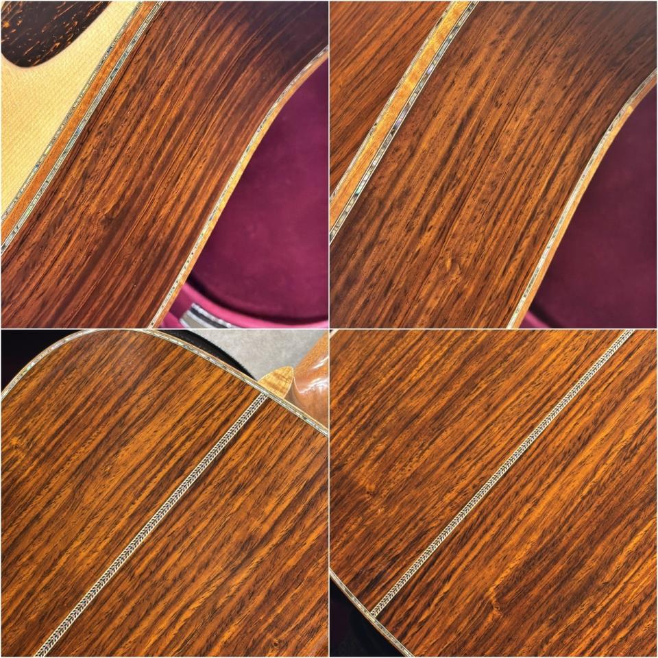 そして、その周囲にはD-45スタイルを象徴する豪華なセレクトアバロン・パールのパーフリングが施され、ギターの輪郭全体がダイヤモンドのように豪華に輝いています。