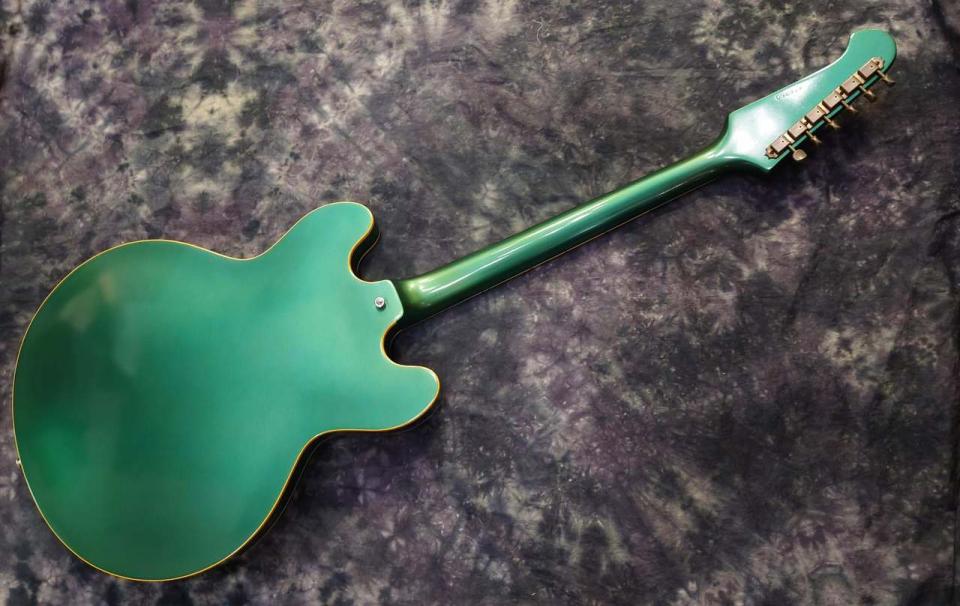 1967年製トリニ・ロペス・モデル。独特なヘッドとダイヤモンド・ホール。PELHAM BLUEにリフィニッシュ されたギター。リナット、リフレットされて、調整済み。すぐに使えるギターです。ナンバード・ピックアップ、ブリッジ、テイルピースなどはオリジナル。サウンドは、1960年代後半らしいエッジの効いた音です。お勧めの1本。