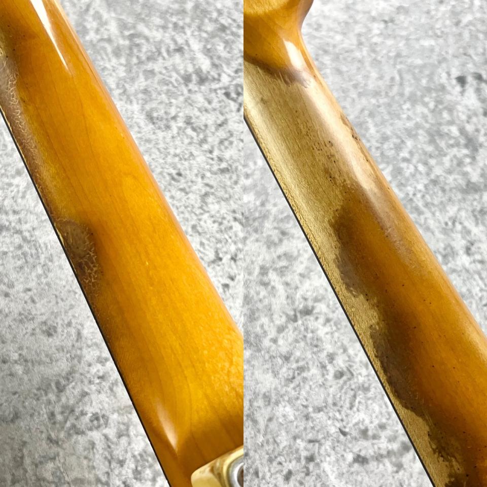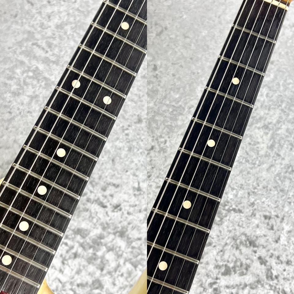 Relic仕上げに加えて、Thin Laquerによる塗装のヒケ、エルボー部分やネックバックの塗装落ち等、使用が強いコンディションとなりますが、それによる”使われてきた楽器”が放つオーラを有した貫禄満載の一本です。