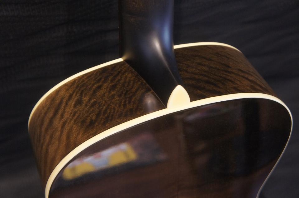 シトカスプルース単板トップに、美しい杢目と硬質ながら甘い高音が特徴のフレイムメイプル単板サイドバック、