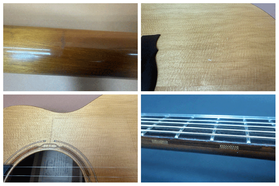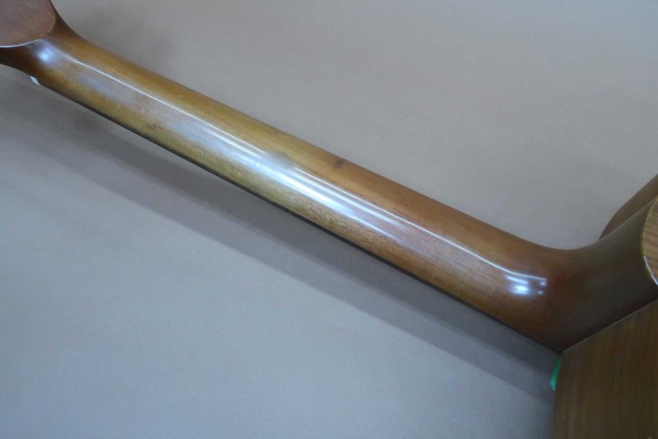 滋賀県米原市に工房を構えるルシアー戸田 真次氏の希少モデル、TODA Guitars(戸田 真次)A-1 STDの入荷です。戸田氏は多くのルシアーの中でも工作技術の作り込み精度はトップクラスで、約30年以上のキャリアを持ち、アコースティックギターだけではなく、特にウクレレのハイエンドモデルやエレキ、ハープギターなど、かなり幅広い楽器製作を手掛けるハンドメイド・ルシアーです。本器は16インチ弱のスモールジャンボ・スタイルのAタイプボディー。トップはシダー単板、サイド&バックはマホガニー単板、エボニー指板&ブリッジ、ヘリンボーン・サイドポジションマーク、マホガニーネック、ウッドバインディング、ワンポイント・アバロン木象嵌ロゼッタ、透明スクエアー・ピックガードのシンプルなルックスですが作り込み精度の高い、TODA Guitarsの初期モデルでシリアルも20番台の逸品です。サウンドは独自のXブレイシングが採用され、Lowden Guitarにも見られるブレイシングの先端が刃先のように削られたデザインで制作されており、シダー材とマホガニーの相性が良くタッチレスポンスに優れ、厚みのある柔らかさと豊潤な鳴りと軽いストロークでもエンジの効いた軽快な鳴りとフィンガーで爪弾いても高音域の倍音が心地良い響きも魅力です。状態はトップのボディ周りに打痕とブリッジ下辺りにもポッ打痕が見られ、塗装のウェザーチェッキングが全体的に薄く見られますが木部のクラックは見受けられません。サイド&バックは軽い擦り傷程度で目立つダメージは見受けられません。ネック裏は7F裏に擦り傷が見られますがそれほど気になる感じでは無いと思います。またネックヒールのピン打ちやピックアップの取り付けはありません。弦長約650mm、ナット幅約43mm、弦高は12F6弦約2.3mm、1弦約1.8mm、サドルの余裕も約3mm有り、フレットも交換されており9分目程度は残っておるネックの反りや元起も見受けられずネックを含めプレヤビリティも良好です。汎用のハードケース付。近年コンサートサイズやテナーサイズの高級ウクレレが入荷後即売れするほどの人気のルシアー戸田氏。プレイヤー向きですが中古市場でも滅多に出ない初期アコースティックギターです。是非この機会にお試しを頂ければ幸いです。