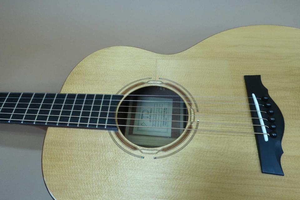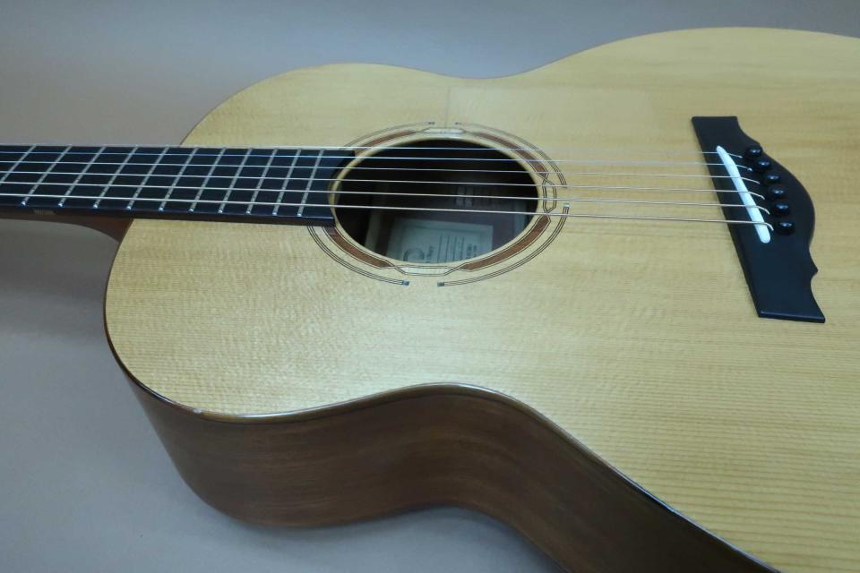 滋賀県米原市に工房を構えるルシアー戸田 真次氏の初期モデル。16インチ弱のスモールジャンボ・スタイル、トップはシダー単板、サイド&バックはマホガニー単板、エボニー指板&ブリッジのシンプルな初期モデル。