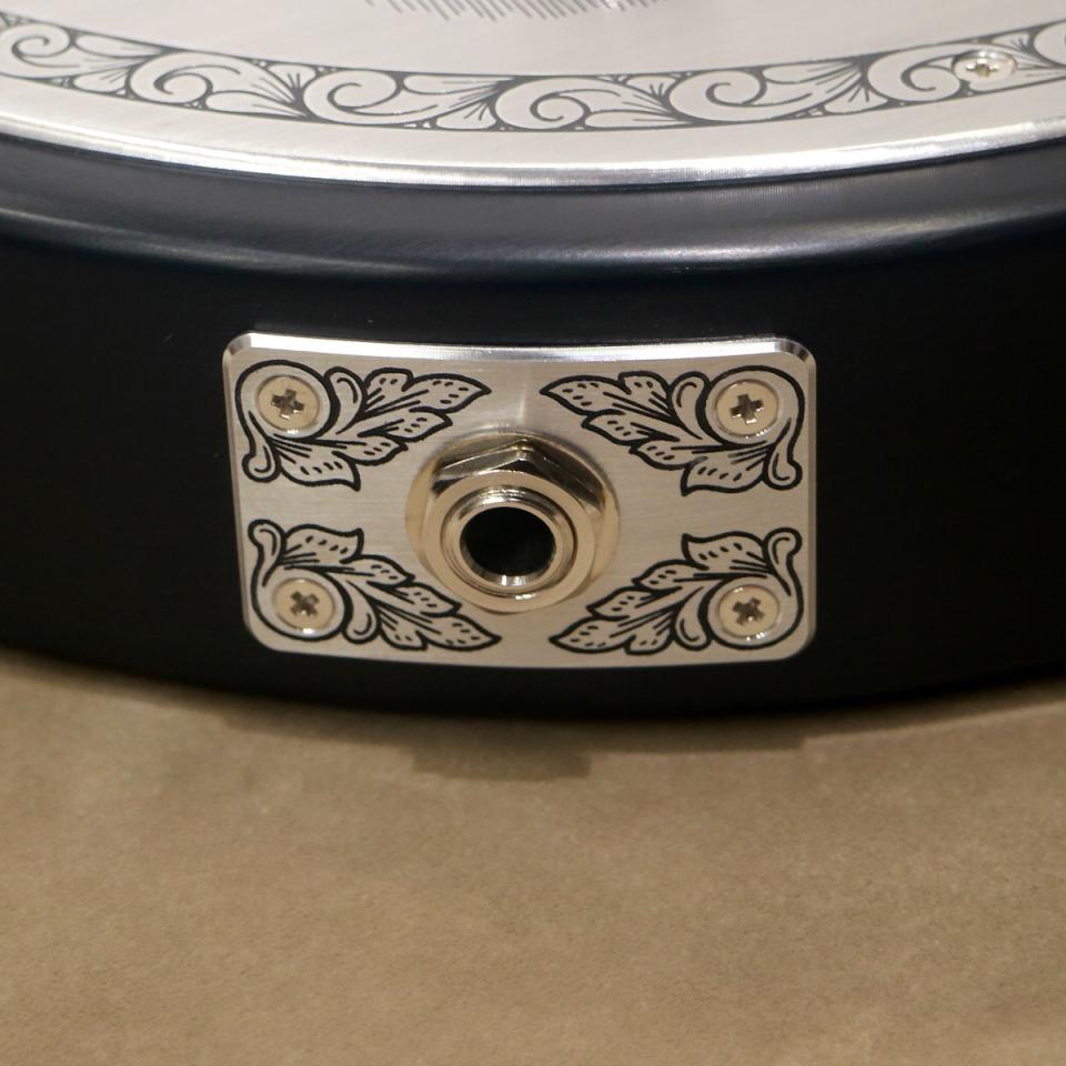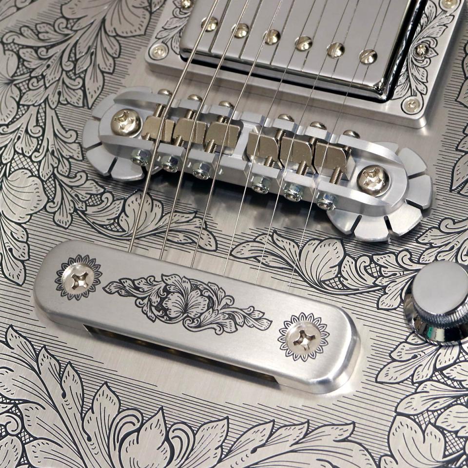 同様にアルミ合金を用いたヘッドのダイアモンド・エンブレム、トラスロッド・カバー、テイルピースやピックアップ・リングをはじめ、アウトプット・ジャック・プレート、コントロール&スイッチ・バック・プレートに至るまで彫金を施しています。