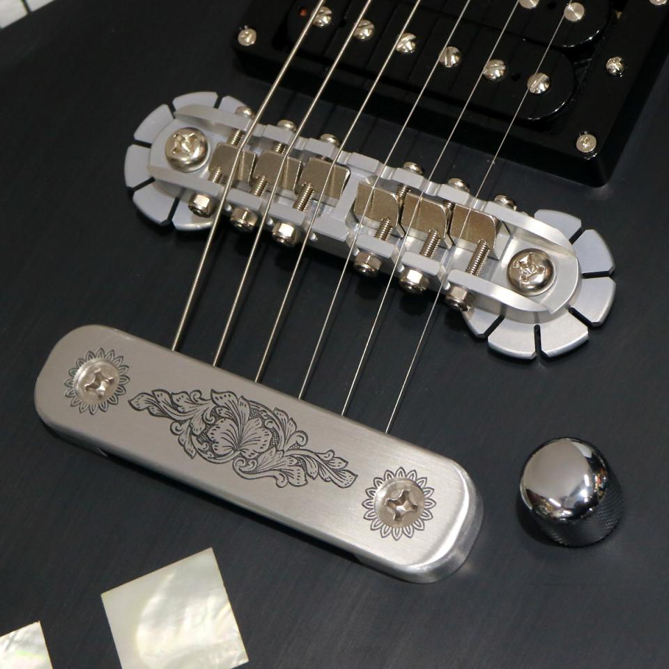 同様にアルミ合金を用いたヘッドのダイアモンド・エンブレム、トラスロッド・カバー、テイルピースやコントロール&スイッチ・バック・プレートに至るまで彫金を施しています。