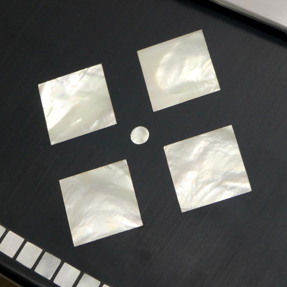 本物のシェルによる微妙な輝きや色味の違いが美しく、マットなブラック・ボディーに映えるデザインになっています。