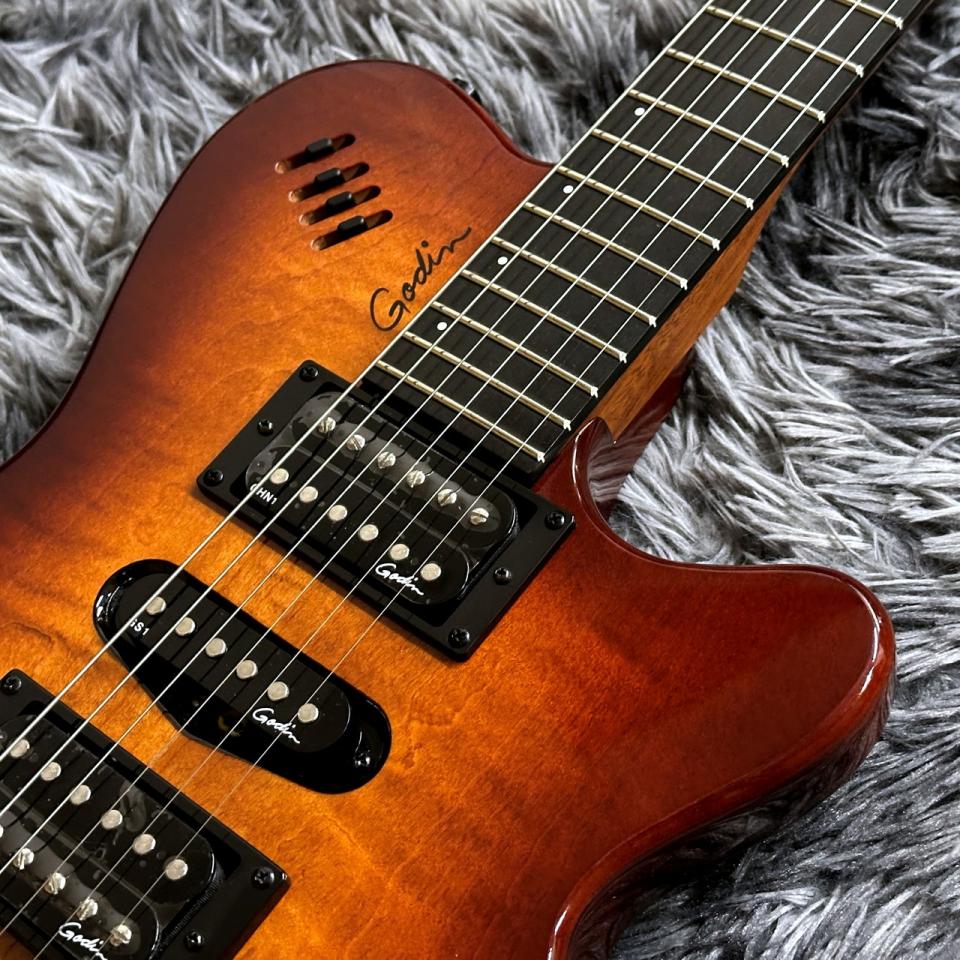 25 1/2インチのスケールとマホガニー・ネックを採用し、ゴダンのエルゴカット技術でシェイプされたリッチライトフィンガーボード、ミディアム・ジャンボ・フレットにより高い演奏性を実現。ボディはシルバーリーフメイプルのセンターブロックにポプラを配し、トップ材としてハイフィギュアドメイプルのプレミアムグレードの単板を装備し、落ち着いたバーストカラーとソリッドな魅力のトランスブラックカラーの2色をラインナップ。美しさとサウンドを両立させています。