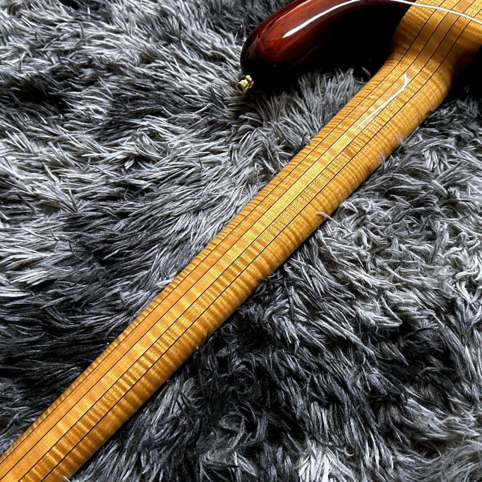 エキゾチックなポプラ・バールをトップ材に使用、カラーは鮮やかな限定カラーHoney Sunset Burstとなっています。見てお分かりの通り、マスターリザーブの圧巻の材です。ボディにはローステッド加工が施された厳選されたスワンプアッシュ材を使用。アッシュ材の特徴であるレンジの広いパワフルなトーンはそのままに、軽量化とより豊かな鳴りを実現しています。指板はがっしりと目の詰まったストライプブラックエボニー材、ネックはこれも厳選素材であることが瞬時に分かる、キラキラと輝く美しく杢の出たローステッドメイプル材3Pを使用。Custom Shop Masterbuiltの限定モデルに相等しいゴージャスな仕上がりです。
