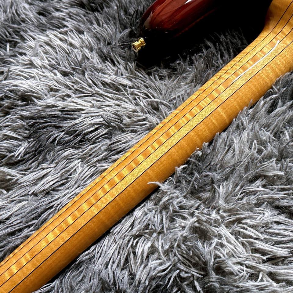 エキゾチックなポプラ・バールをトップ材に使用、カラーは鮮やかな限定カラーHoney Sunset Burstとなっています。見てお分かりの通り、マスターリザーブの圧巻の材です。ボディにはローステッド加工が施された厳選されたスワンプアッシュ材を使用。アッシュ材の特徴であるレンジの広いパワフルなトーンはそのままに、軽量化とより豊かな鳴りを実現しています。指板はがっしりと目の詰まったストライプブラックエボニー材、ネックはこれも厳選素材であることが瞬時に分かる、キラキラと輝く美しく杢の出たローステッドメイプル材3Pを使用。Custom Shop Masterbuiltの限定モデルに相等しいゴージャスな仕上がりです。