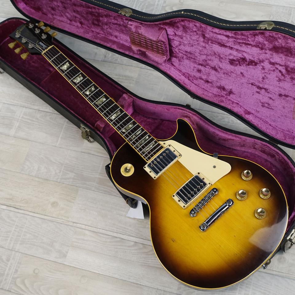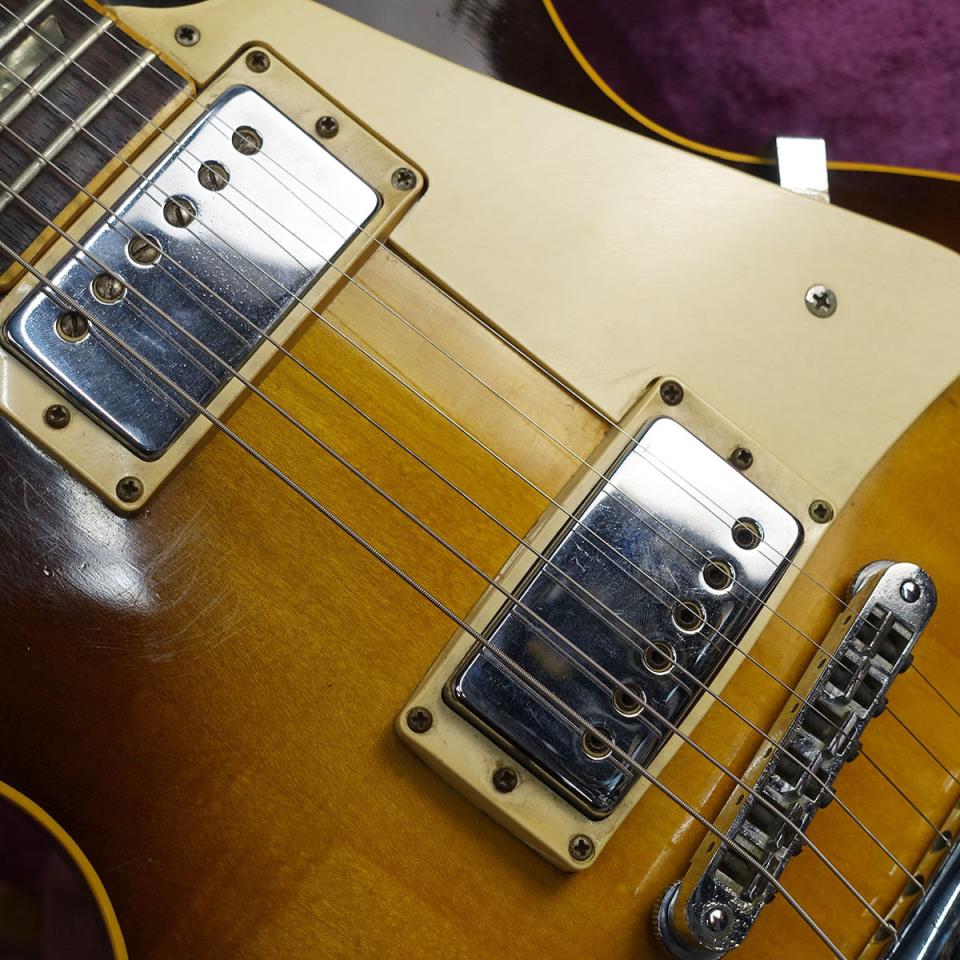 1969年からミニハムバッカー搭載のDeluxeへと置き換わったレスポール。1975年後期頃からレギュラーモデルとして生産再開したStandardですが、ヘッド裏にまだDeluxeの表記を残した過渡期個体です。