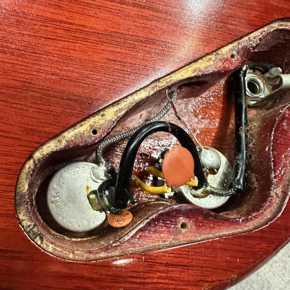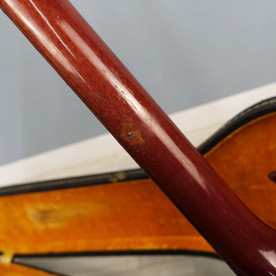 全体にびっしりと入ったウェザーチェックがビンテージの風格を醸し出します。ボディトップのフェンス付近の傷、ネックのスタンド焼け、その他打痕等見受けられますが大きく外観を損ねるようなダメージありません。
