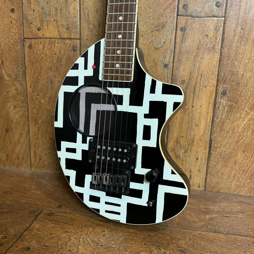 ボディにはトレードマークのギタリズム柄。専用ソフトケースにも同じ柄が入っています。