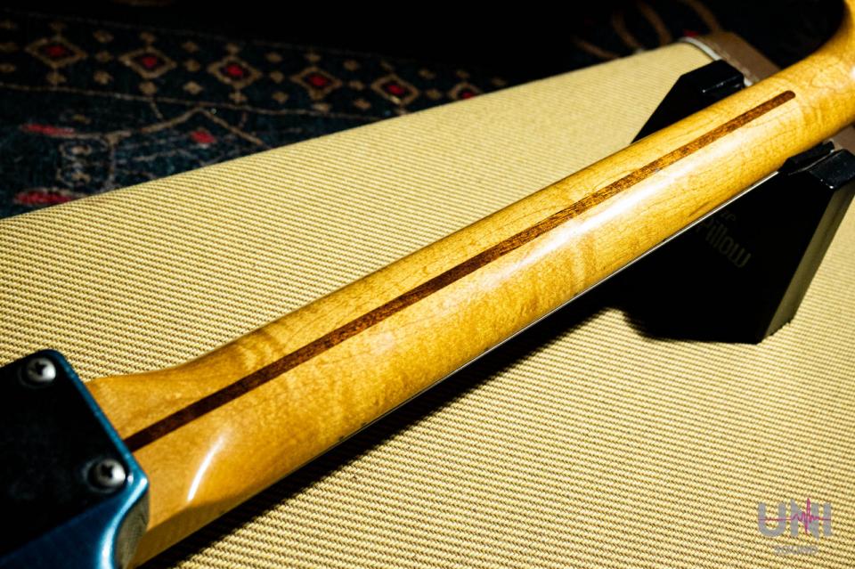 ネック裏には美しいフレイムも確認でき、木材のグレードの高さもさすがマスタービルドといったところ。