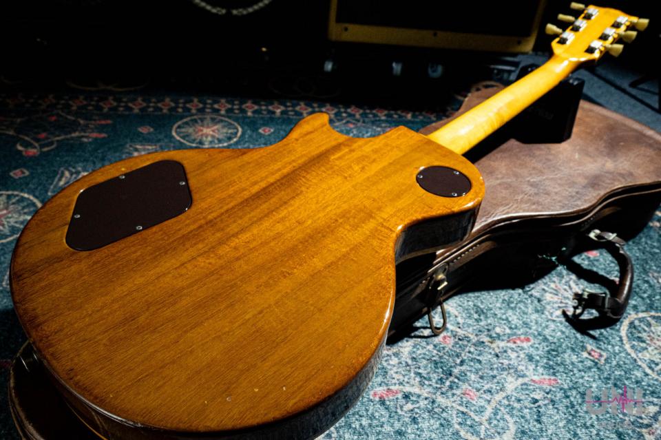 ボディはこの時代の特徴であるパンケーキ構造。マホガニーとマホガニーの板で薄いメイプル材を挟んでボディバックとし、その上にメイプルトップが合わさる構造です。