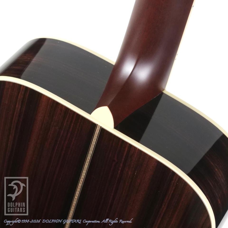 装飾面では、ロゼッタ、パーフリング共に木象嵌によるカウボーイロープパターン、さりげないダイヤモンドポジションインレイ、ヘッドロゴはキラリと輝くパールのスクリプトタイプを選択し、落ち着きと品のある仕上がりとなりました。ロープデザインはシンプルながら存在感があります。