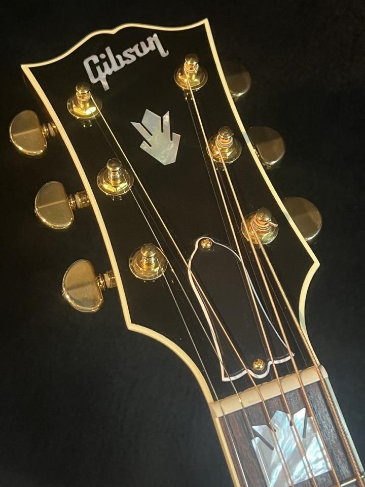 1930年代のアメリカ、まだテレビが家庭に普及していなかった時代、娯楽としてカウボーイ映画が人気を博していました。スクリーンの中でギターを弾きながら歌うシンギング・カウボーイの頂点にいたのがレイ・ウィットリー。彼はスクリーンの中での派手な衣装に似合うスペシャルなギターをGibson社に依頼。その結果1937年に生まれたのがSuper Jumbo 200。翌年より当時200ドルと破格の値段で量産化されましたが1942年、戦争による生産中断。戦前の生産本数は非常に希少であり僅か100本程度との記録があります。1947年に生産再開となりますがサイド&バックの素材がローズウッドからメイプルに変更となり、他モデル同様にナチュラルカラーが追加され現在に至ります。