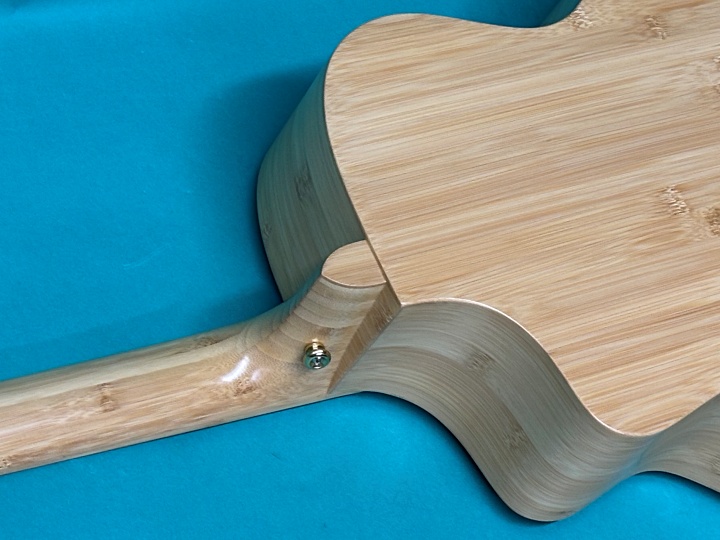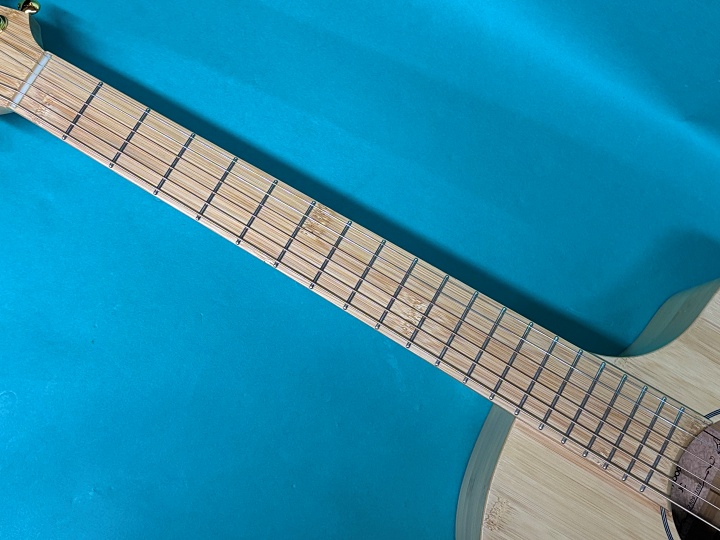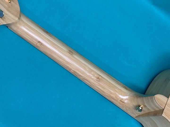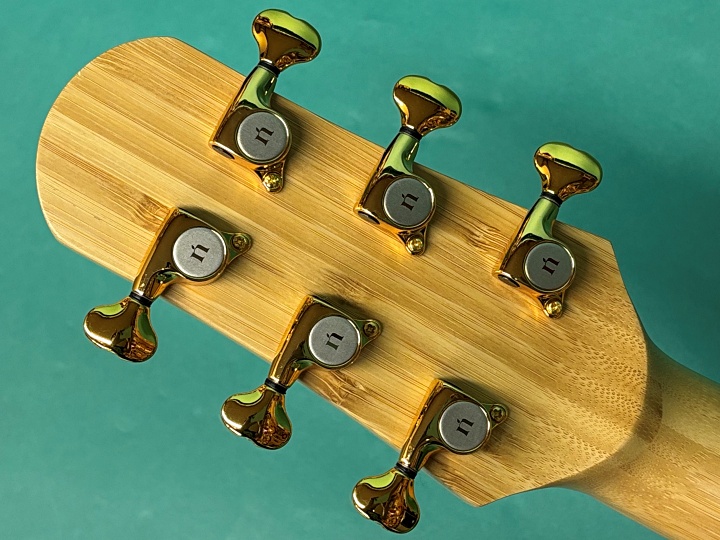 本モデルは、ナターシャの定番ボディシェイプであるJCスタイルに、トップ・サイド・バック・ネック・指板・ブリッジ・ヘッドプレートに至るまで、すべて竹材が使用されています。ナット幅は43mm、スケールは650mmで、カッタウェイも採用されているため、ハイポジションでの演奏もスムーズです。ペグもオリジナルで、ゴールドメッキの剥がれもなく、動作もスムーズで良好な状態を保っています。