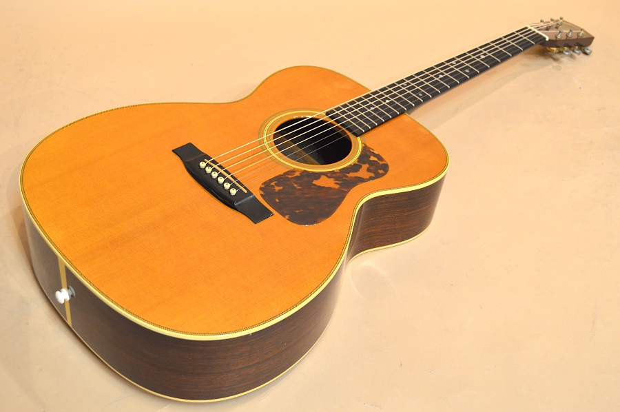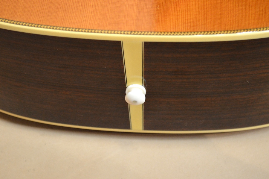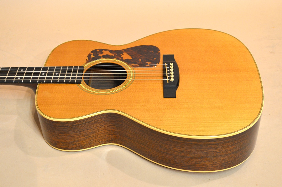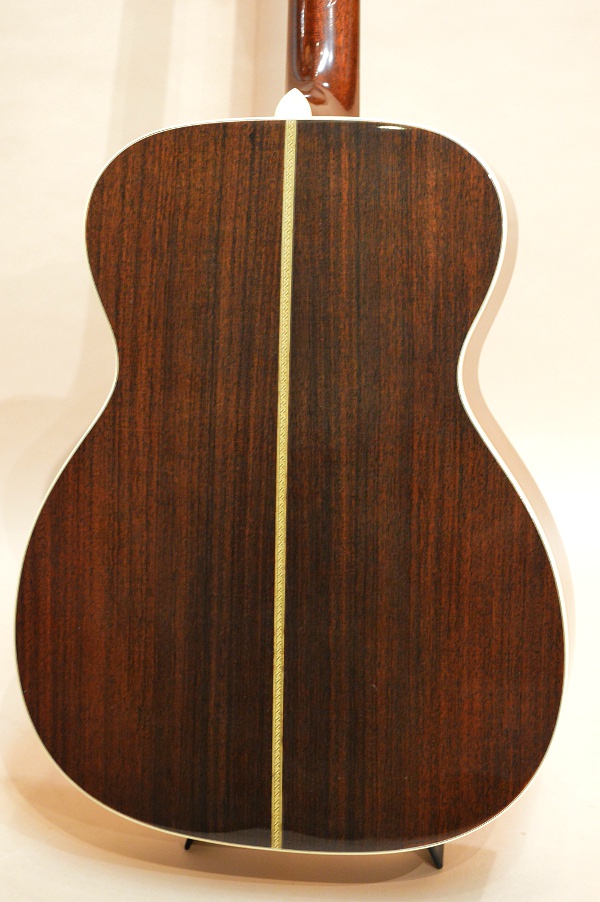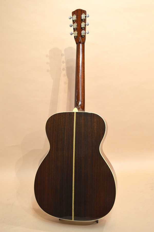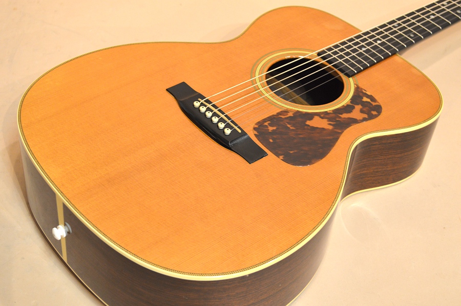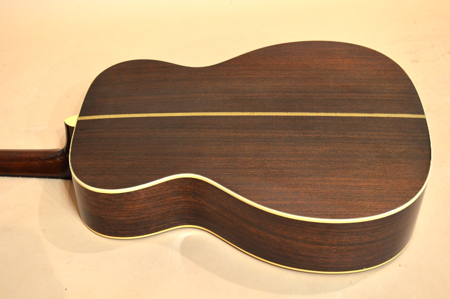 ソリッド・スプルースTOP、ソリッド・ローズウッドSIDE&BACK、マホガニー1ピースNECK、エボニー指板&ブリッジ、実測42.8mmナット、633mmスケールのオーディトリアム・ボディー。000スタイル最上位機種だけあってヘッドにはイーグル・インレイが入り、ペグはクルーソン・タイプのワッフル・バック・ゴールド、本べっ甲の塗り込みPGにヘリンボーン・トリム、ヘッドウェイのフラッグシップ・モデルHD-115をも超える1ピース・ネックなどなど、高級機種らしい豪華な仕様となっています!