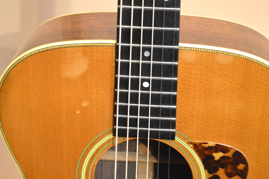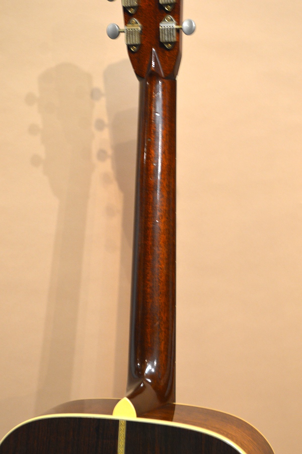 ネック・コンディションも良好で綺麗にストレート、現状での弦高は12フレット上で6弦側2.5mm、1弦側1.9mm程度と非常に弾き易いセッティングになっています。サドルにはもうあまり余裕がありませんが、現状でもプレイヤビリティーはバツグンかと思います。フレットはローフレットを中心にいくらか減りが見られますが、一番減っている箇所でもオリジナルの8~9割程度の高さが残っていますので、まだまだ安心してお使い頂けます。