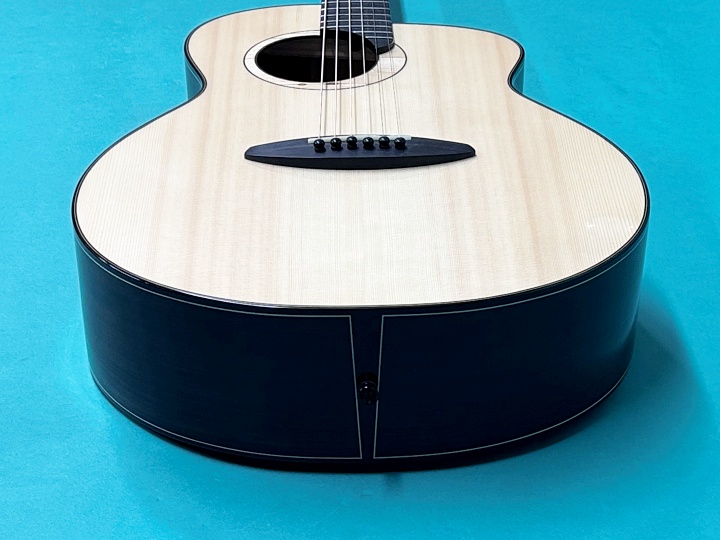 ブレイシングパターンは、杉田氏がオフセットサウンドホール向けに設計した「一体共振」ブレイシングを採用。弦の振動がトップ板からボディ、ネック、ヘッドストックにまで伝わり、豊かな音色を実現しています。また、トップ板の厚みを2.5mmに抑えることで、硬質な音色を和らげ、柔らかくしなやかなサウンドを表現しています。