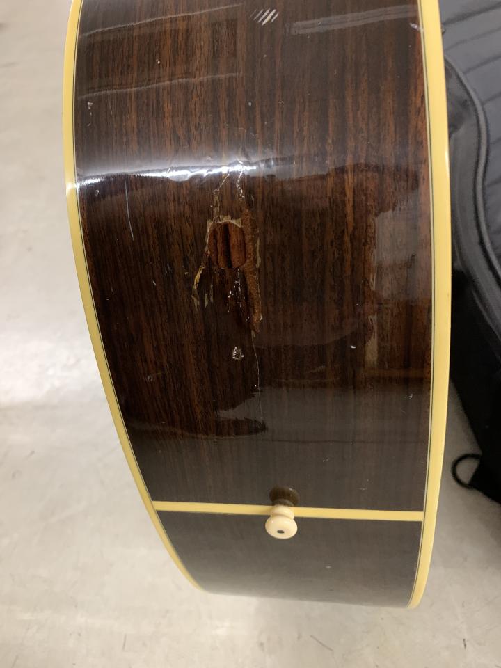 良く弾き込まれた、サウンドホール周りにはピックキズ その他の弾きキズ、スリキズや打コンなどがあり ボディーサイドに割れの修理歴(写真 12)があります。