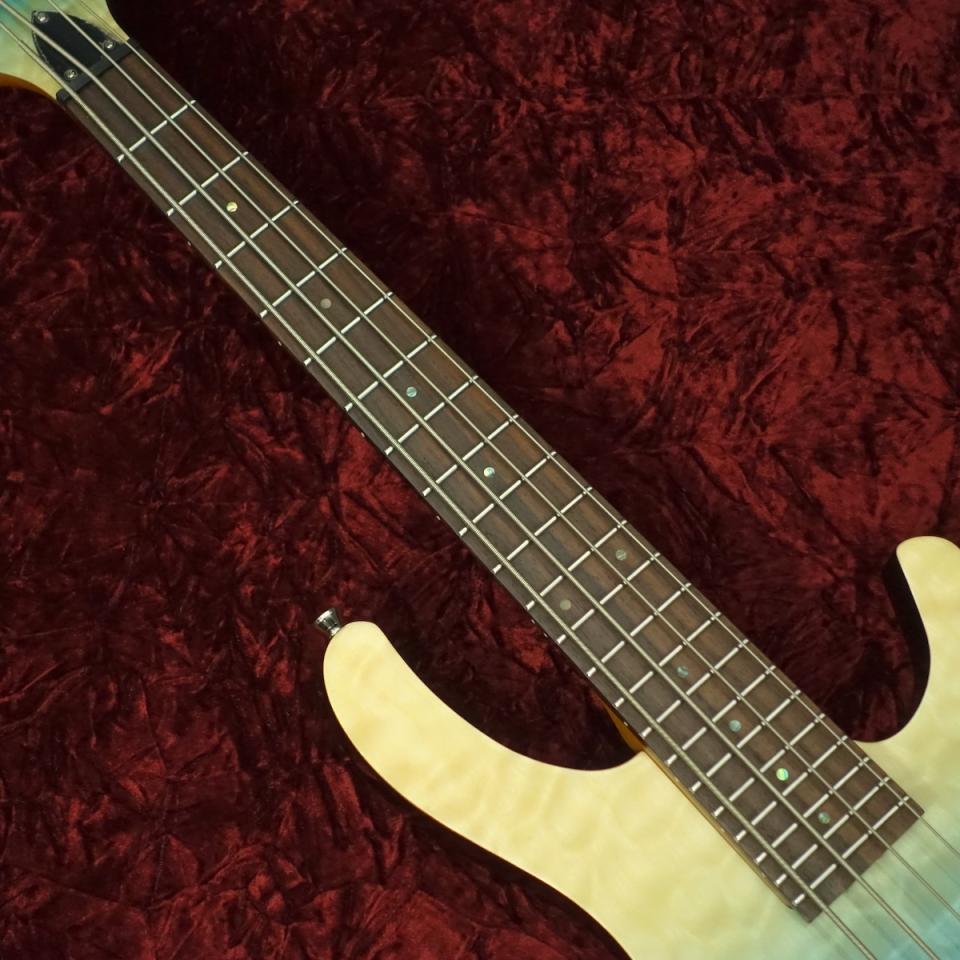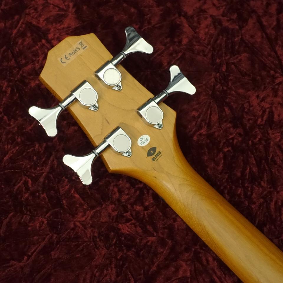 キルトメイプルトップ、ソリッドマホガニーバックのボディに、ローステッドメイプルネック、ローズウッドフィンガーボードをセットした本格的なウッドマテリアル。エレキウクレレと同様にソリッドボディに金属弦という【エレキベース】と同じ仕様。それでいて弦長は23インチ(584mm)と、ベースとしては超ショートスケール。