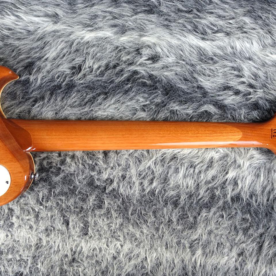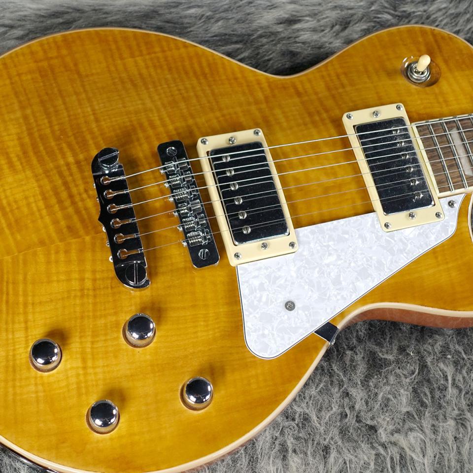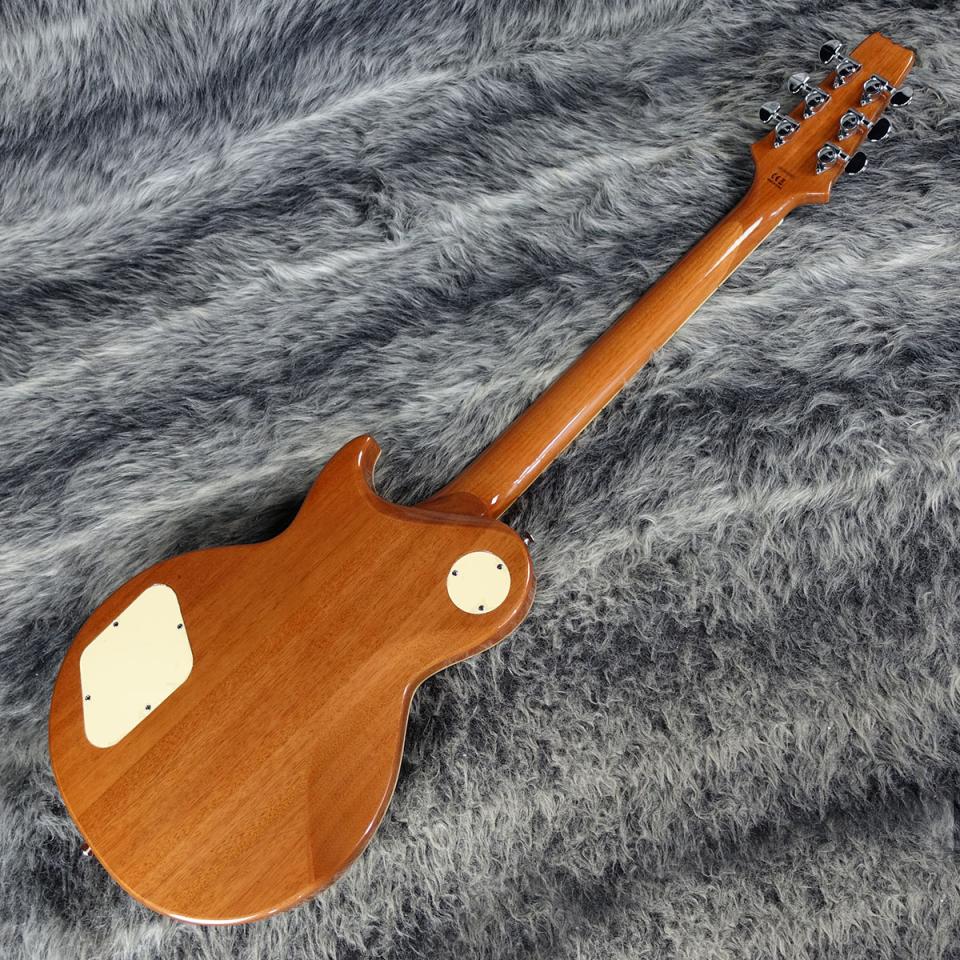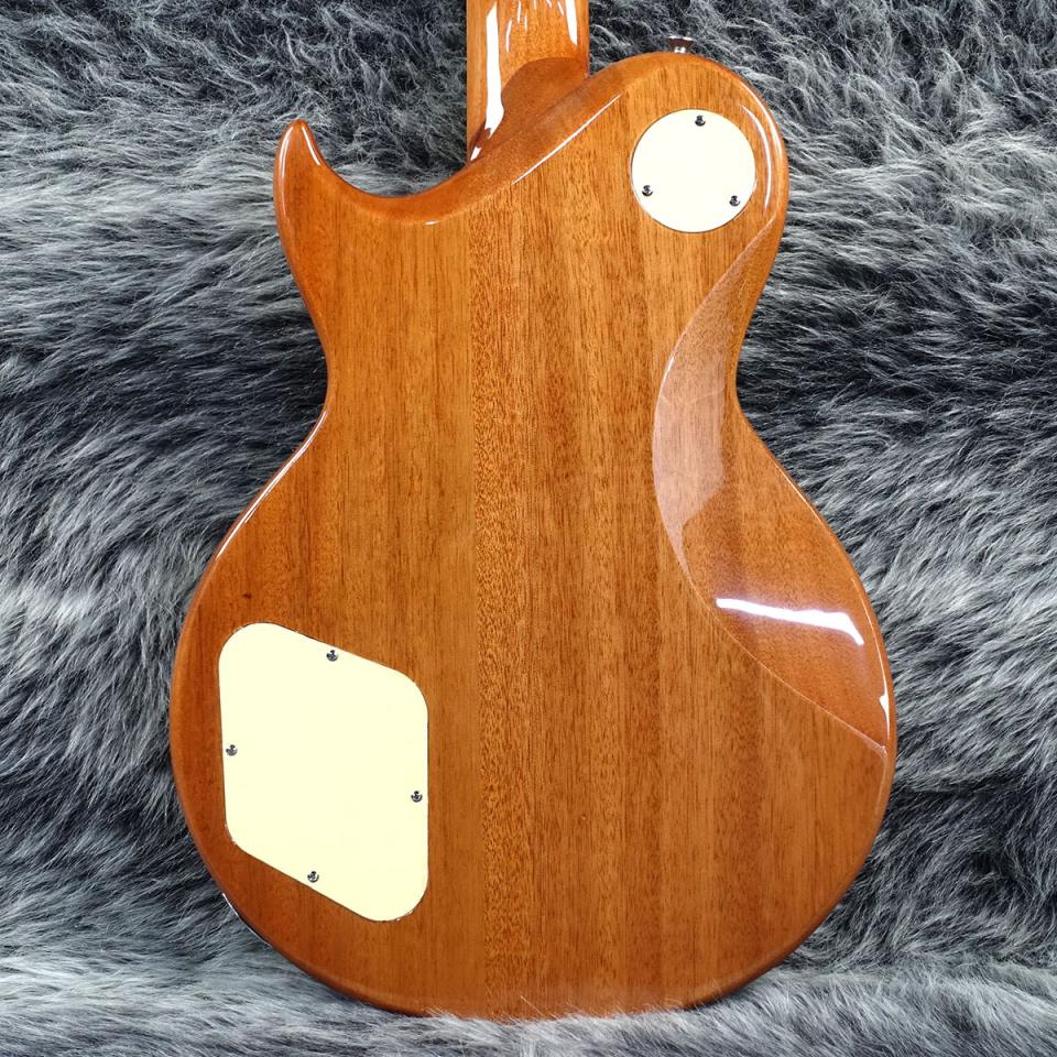 本器は、美しい細やかなフレイム杢を持ったメイプルトップのマホガニーボディ、マホガニーネックに、ローズウッド指板といった妥協のないウッドマテリアル。ピックガードにはパーロイドが使用されており、高級感を感じる意匠。