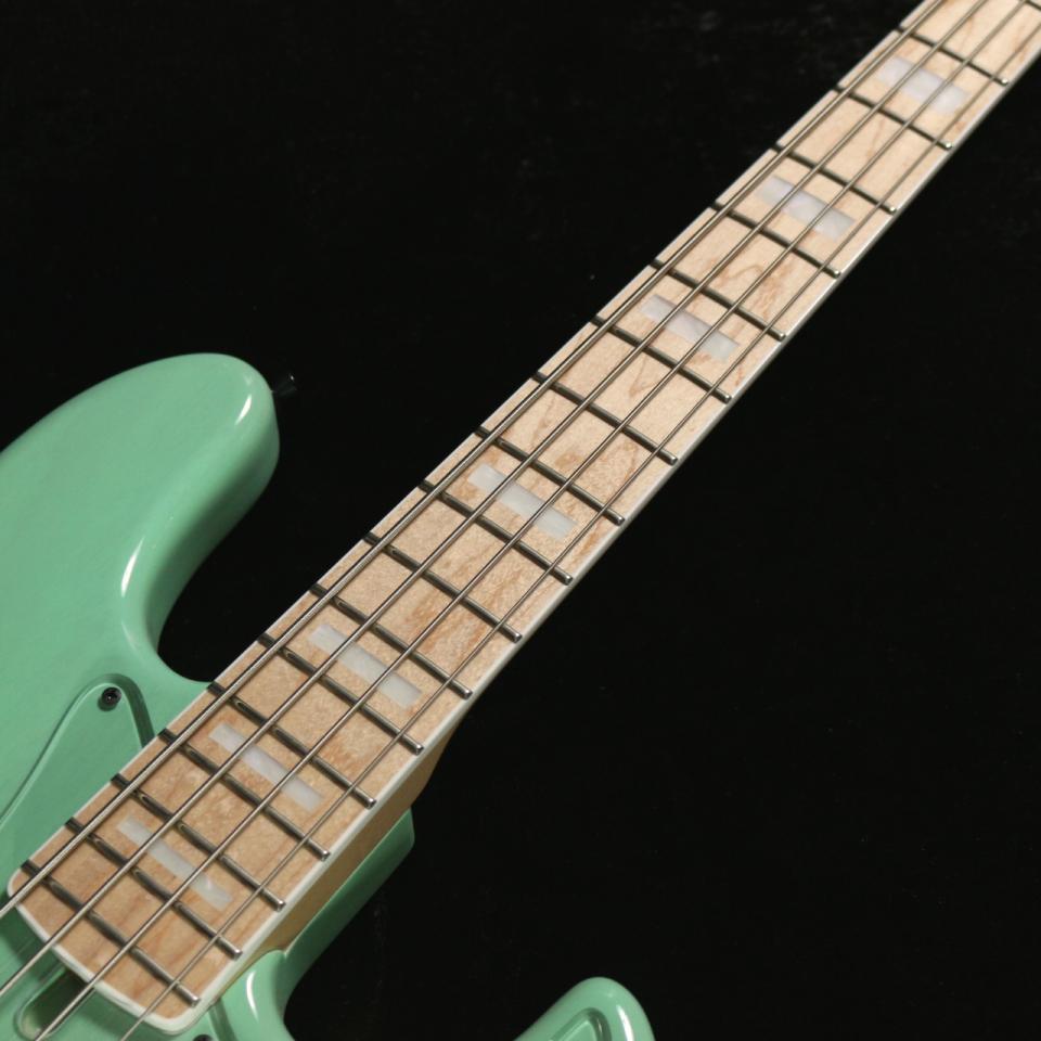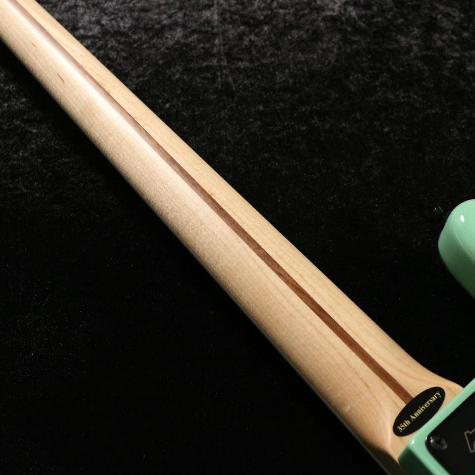 カラーはカスタムカラーである"トランスペアレント・シーフォームグリーン"をマッチングヘッド仕様で採用しており、ブロックインレイが埋め込まれたメイプル指板の白みと非常に相性の良いカラーリングとなっております。