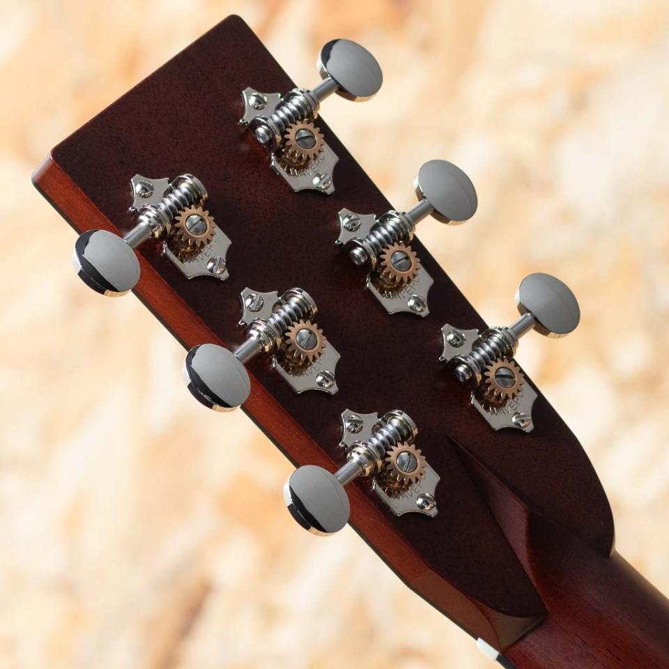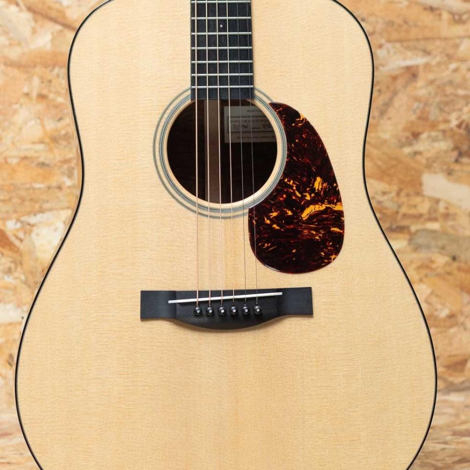 カリフォルニア洲の閑静な港町、サンタクルーズで30年以上もギターを製作しているルシアー集団、"Santa Cruz Guitar Company"。ジェフ・トラゴット、リック・ターナー、シャンティギターのマイケル・ホーニック等々、このブランドに関わっていた製作家を挙げ出すとキリがなく、アコギ造りについては西海岸の聖地的存在といっても過言ではありません。本器は弊社が現地にて材の選定を行ったオーダー品”D Pre-war Custom”。スプルーストップ、キルテッドサペリサイド&バック、マホガニーネック、エボニー指板&ブリッジ、スルーサドルブリッジスタイル、MOPドット指板インレイ、ウェイバリーオーバルノブニッケルペグ、スキャロップドアドバンスXブレーシング。最初に目に惹きつけられるサイド&バックに使用されたサペリ材のキルテッド杢の美しさはもちろんのこと、トップのスプルースも非常にきめ細やかな極上材。その佇まいからは自然の造形美を強く感じさせられます。各弦の分離が良く、ウッディで温かみのあるサウンドながらしっかりとした芯を感じさせる立ち上がりは、和音でも単音でも一音一音が立体的に響く心地よさ。フィンガーでも色気漂うプレーン弦の響きがメロディーラインを美しく際立たせてくれ、広いスタイルに対応できるオールマイティさをも持っています。サテンフィニッシュのややソフトなVシェイプのネックは手に吸い付くようなフィッティングで、長時間の演奏でもストレスを感じさせず、繊細なニュアンスから力強いタッチまで自然に引き出してくれます。ポテンシャルの非常に高い上質のアメリカンギター。是非お手元でご体感下さい。