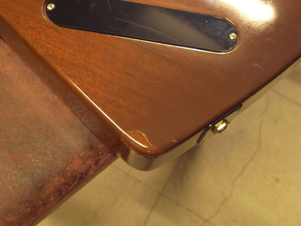 外観上はヘッドの6弦ペグ付近にタバコの焦げ跡、ボディ下部に一部塗装のはがれがあり、その他全体に多少の傷はありますが、木部に対する深いダメージはありません。