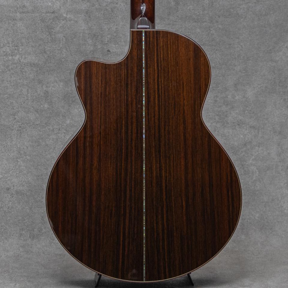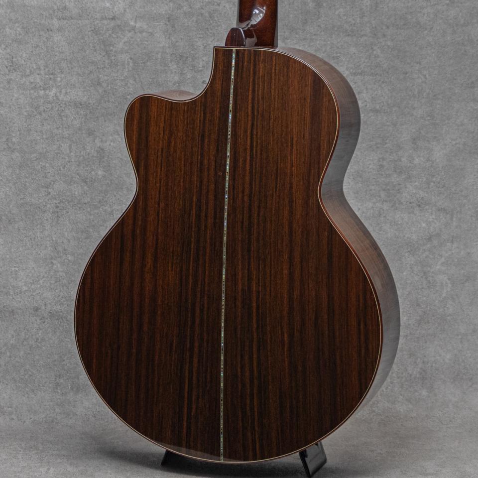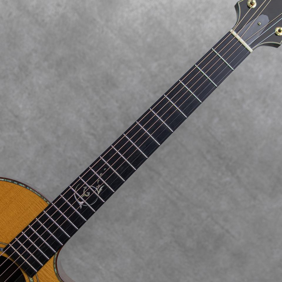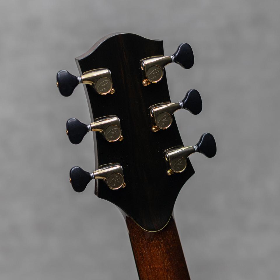 Bookmark Register for price cut notificationギターの構造を三次元的な角度から研究するアメリカントップルシアー”Kevin Ryan(ケビン・ライアン)”。彼は前職が航空機開発研究という異色の経歴を持ちあわせる、人気・実力ともにアメリカを代表する製作家のひとりです。本器は、彼の出世作モデルのひとつでもある16"ボディの美しい流線型のアウトラインを持つ”Nightingale Grand Sololist Cutaway”。クールなアームベベル、ベネティアンカッタウェイを備えた1本。すでに高い完成度を持つ2004年製極上USED品。とても目の詰まった全面にゆらめく柾目痕が眩い極上のシトカスプルーストップ、真っ直ぐな美しい杢目のイーストインディアンローズウッド、ワンピースマホガニーネック、エボニー指板&ブリッジ、ゴトー製510ペグ、パウアシェルヘッドロゴ、アバロン指板フローラルインレイ、クリアピックガード、パウアシェルロゼッタ&トリムインレイ、パウアシェルバックストリップ、ベネチアンカッタウェイ、ベベルドアームレスト。トップ構造は平たいスキャロップド・エックスブレイシングを軸とした独自のパターンです。ロウワバウトにしっかりと容量を持たせた独特な美しいフォルムのライアン・ナイチンゲール。まんまるなロウワバウトはしっかりとしたトップ面積を確保し、豊かな低音と音域をもたらしてくれます。奥深く重厚に響く倍音、そしてそれに埋もれないロングサスティーンのトーン。野太く伸びやかに、そして艶やかに響く至極のトーンは、この時期からすでに確立され健在です。よく響きながらも重厚に響くライアンサウンド、フィンガータッチでも驚くほどの大音量で迫力のサウンドをしっかりと魅せてくれます。20数年の経年を感じさせない極上コンディションの本器。打痕や弾き傷など目立つ傷もなく良好、ネックヒールに若干のUV塗装の浮きが見られますが、剥がれ落ちの懸念もなく良好です。ネックまわりもとても良好で、弾きやすいアクションをしっかりと保っています。力強くワイドレンジに、かつ軽快でしっかりとしたレンスポンス。トップルシアー辿り着いたアメリカンルシアーギターの一端を体感できる逸品。ギター然とした弾きやすく高品位なサウンドを、是非お手元でご堪能ください。オリジナルハードケース付属