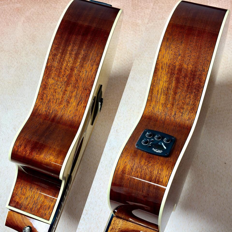 当モデルでは、表面がスプルース、側面&裏面がマホガニーの木材で構成されており、豊かなハーモニーを奏でる事が可能になっております。ピックなどで弾くと力強いサウンドも演奏可能なため、あらゆるジャンルで使用可能な一本となっております!