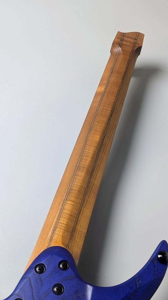 チェンバードボディ: スワンプアッシュのチェンバードボディにメイプルトップを組み合わせ、軽量(ヘッドレス)かつ豊かな鳴りを両立。長時間の演奏でも疲労を感じさせません。