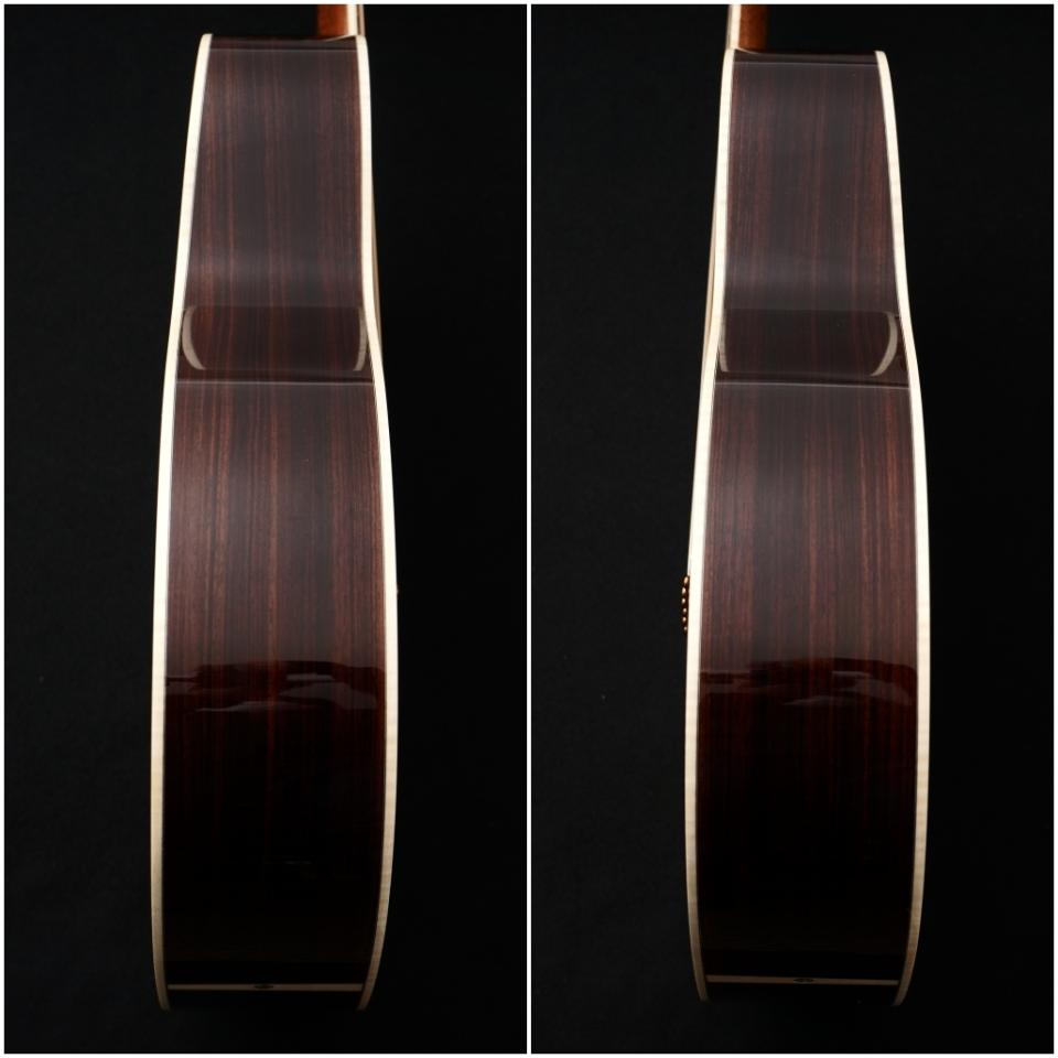 更にスキャロップ加工と呼ばれる削り込みを施したXブレイシングとなっており、ブレイシングを軽量化しトップ面の振動面積を広くとることで、ヴィンテージマーティン同様のふくよかなボディ鳴りが得られます。