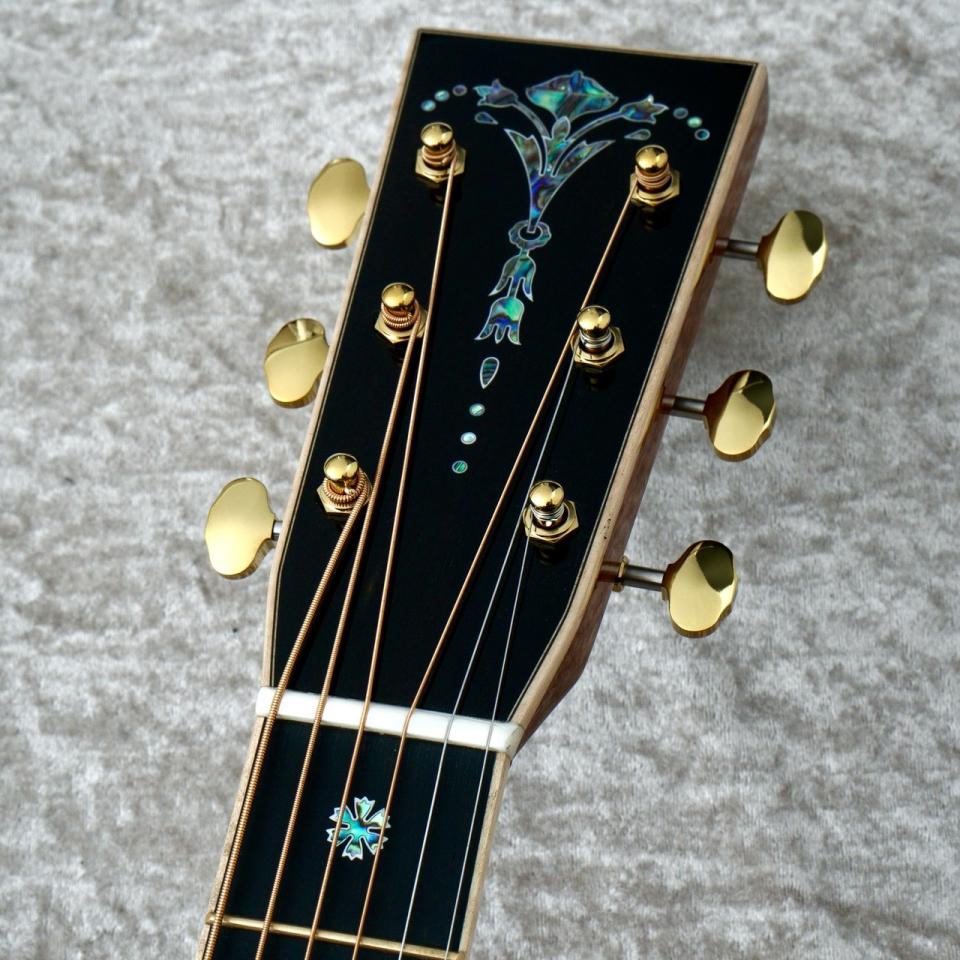 天然系の接着剤(ナチュラルプロテイングルー)を使用し、外観はヨーロピアンフレイムメイプルバインディング(ボディ、指板、ヘッドプレート)、スタイリッシュなゴールドフレット、ゴールドのオープンギアチューナー、ヘッドストックにはパールで縁どりされた華やかなアヴァロンのトーチロゴ、指板にもパールとアヴァロンでゴールデンエラスタイルのスノーフレイクインレイがあしらわれています。