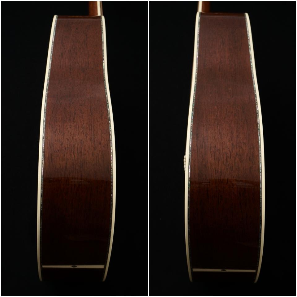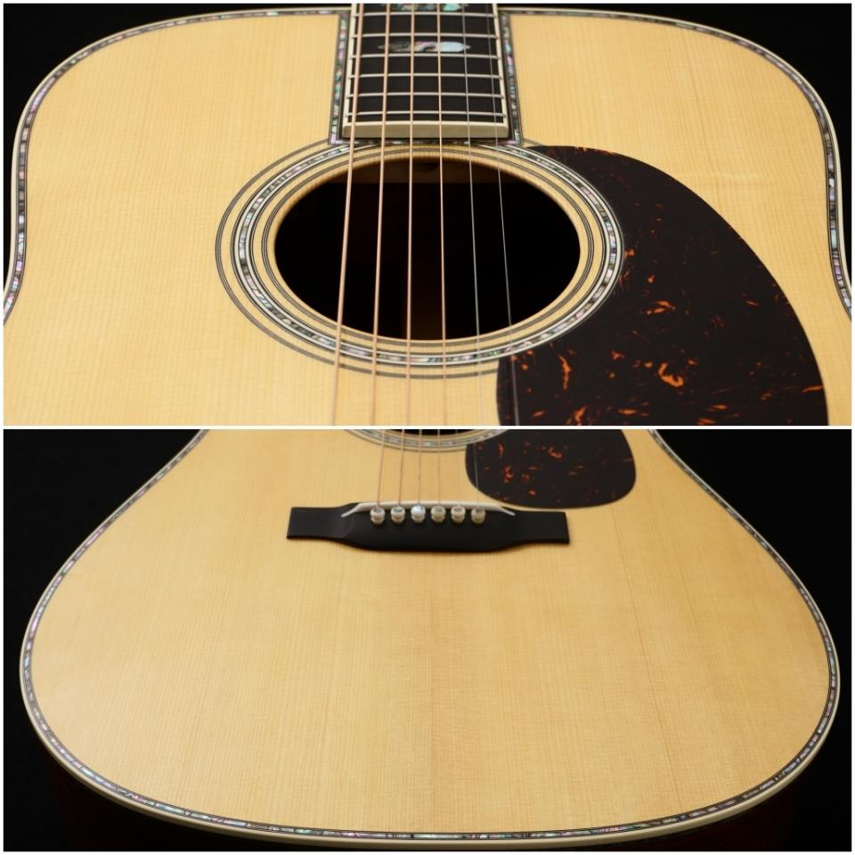 カバードタイプのグローバーペグをはじめ、塗り込みのピックガードやロングサドル、ラージドットのブリッジピンなど細部も当時のディテールが再現されており、現在におけるD-45の到達点と言っても過言ではありません。