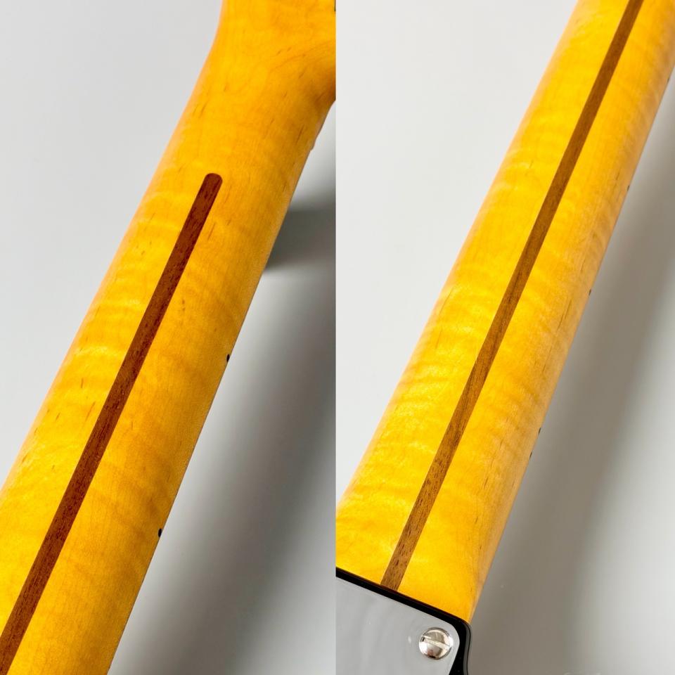 その一方で、ネックには厳選された3Aグレード・フレイムメイプルを採用。量産モデルではまず見られない立体的で深みのある杢目は、一本一本が明確な個性を持ち、所有する歓びを強く刺激します。1951年当時のUシェイプではなく、あえてCシェイプを採用することで、ヴィンテージルックスを保ちながらも、現代的な握りやすさと高い操作性を実現しました。