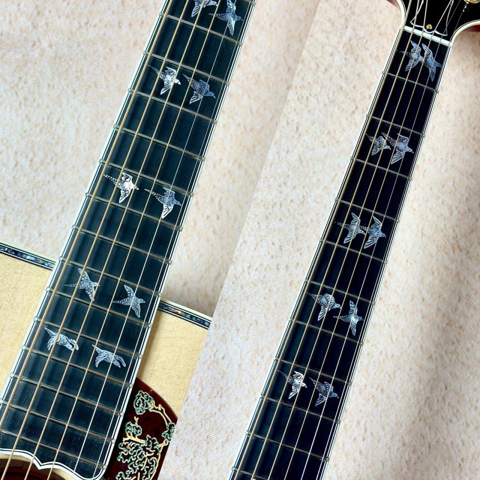 本モデル最大の特徴は、合計28羽分のエングレーヴされたダヴ(鳩)のインレイが贅沢にあしらわれており、ヘッドストック上に7羽、指板上に16羽、ピックガード上に3羽、そしてブリッジベース上に2羽が配置されています。それぞれのダヴはすべて異なる表情でデザインされており、クラフトマンの手仕事ならではの温もりと芸術性を感じさせます。さらに、チューナーノブに至るまで手作業による彫金が施されるなど、細部へのこだわりも圧巻です。