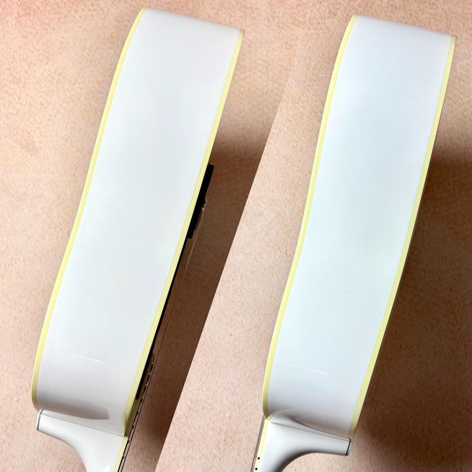本機はアルパインホワイト仕様のスペシャルモデル。真っ白なボディにアイボリーのバインディングがアクセントとなっており、レギュラーラインのDOVEにはないヘッドのバインディングも特徴です。