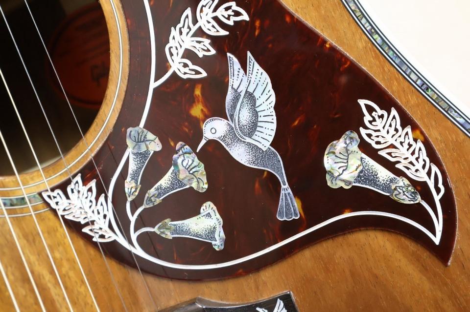 指板上に舞うハチドリのインレイは、とてもかわいく美しい存在感を放ちます。