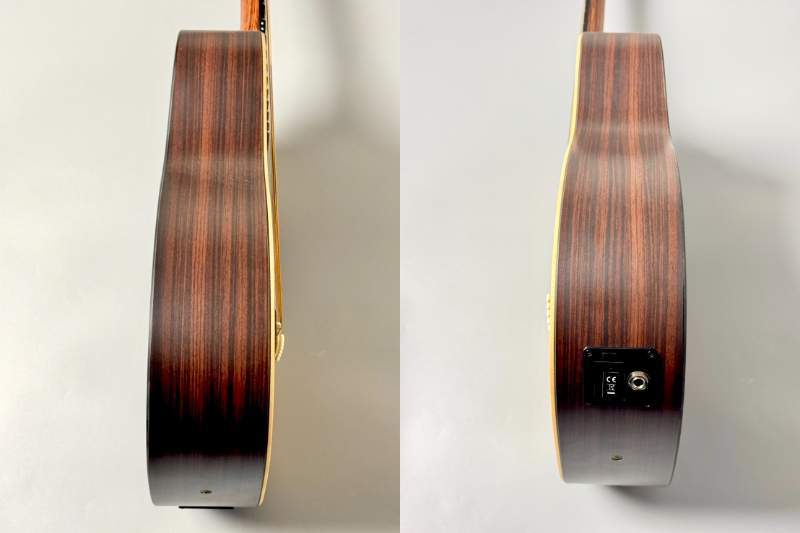 バック/サイドは 耐久性の高い HPL(ハイプレッシャー・ラミネイト)でローズウッド柄の仕上げ とし、