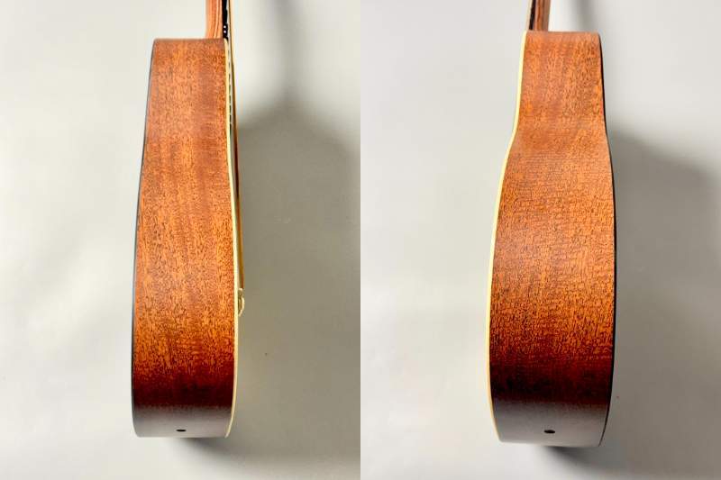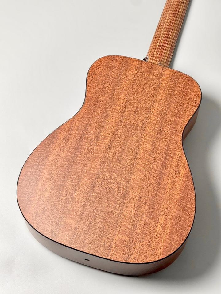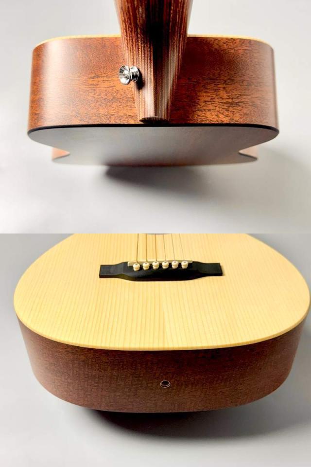 ボディはModified 0-14フレット仕様のコンパクト・シェイプを採用し、トップ材にシトカ・スプルース単板を使用。高音の伸びと明瞭なアタック感を実現しつつ、背・側板には耐久性に優れるマホガニーパターンHPLを採用することで、湿度変化や持ち運びにも強いギターに仕上がっています。