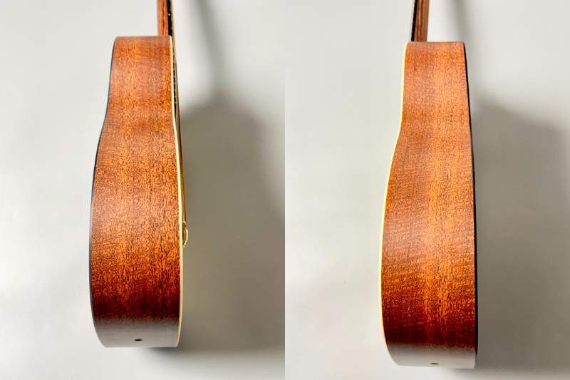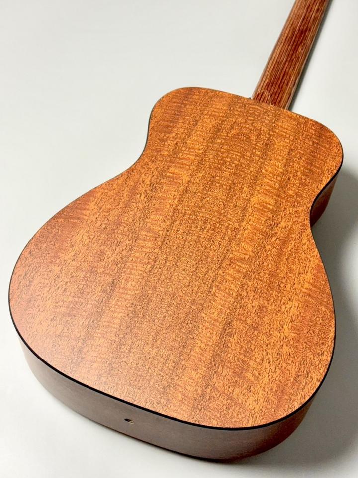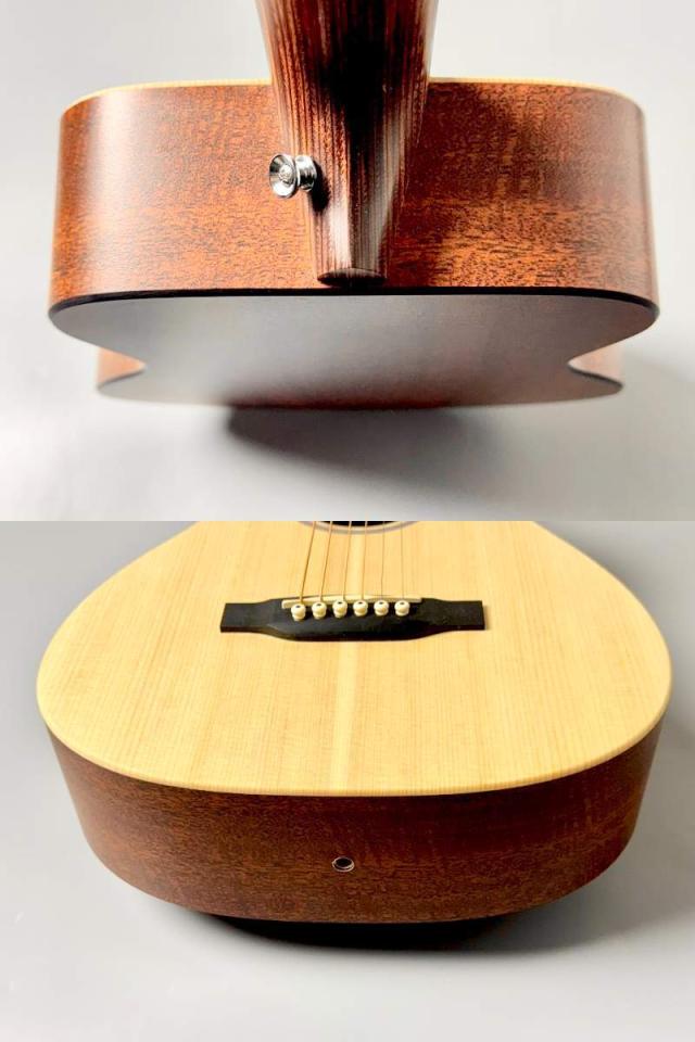 ボディはModified 0-14フレット仕様のコンパクト・シェイプを採用し、トップ材にシトカ・スプルース単板を使用。高音の伸びと明瞭なアタック感を実現しつつ、背・側板には耐久性に優れるマホガニーパターンHPLを採用することで、湿度変化や持ち運びにも強いギターに仕上がっています。