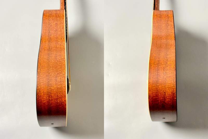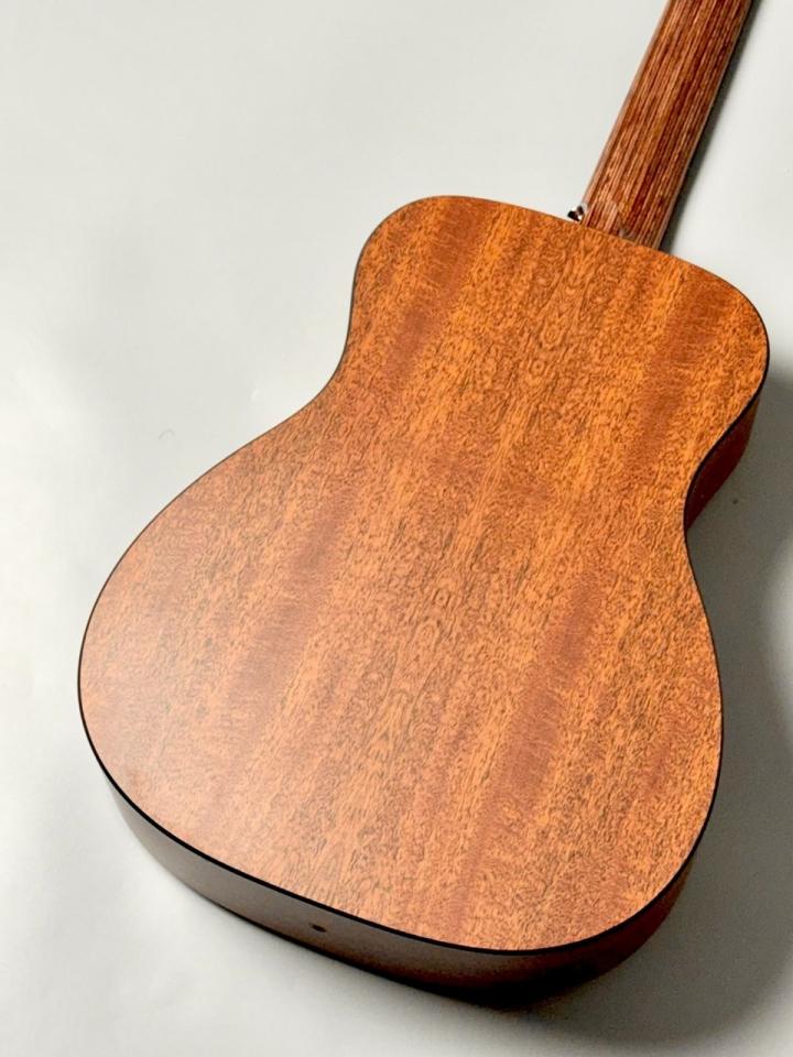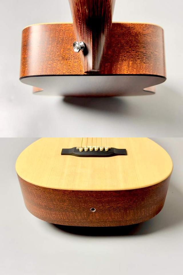 ボディはModified 0-14フレット仕様のコンパクト・シェイプを採用し、トップ材にシトカ・スプルース単板を使用。高音の伸びと明瞭なアタック感を実現しつつ、背・側板には耐久性に優れるマホガニーパターンHPLを採用することで、湿度変化や持ち運びにも強いギターに仕上がっています。