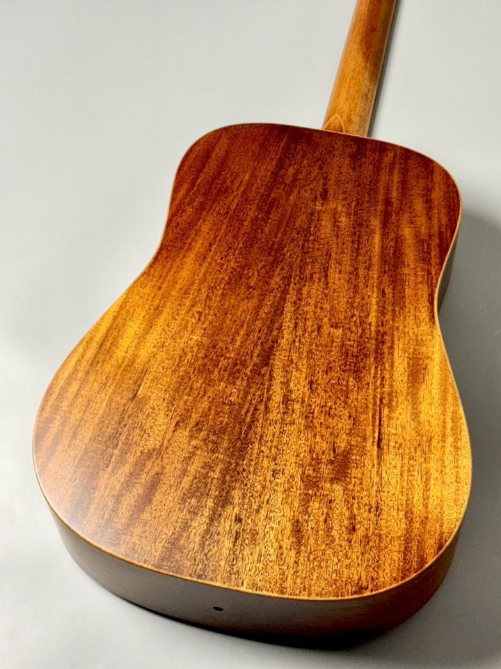 トップ、サイド、バックに すべてソリッド・マホガニー材 を採用し、落ち着いたミッドレンジとクリアなアタックを実現。ドレッドノートならではの力強いプロジェクションとバランスの良い鳴りは、ストロークでもフィンガーピッキングでも魅力的に響きます。ブレーシングは スプルース製ノンスキャロップド X ブレース で、ピッチの明瞭さとタイトなレスポンスを両立。