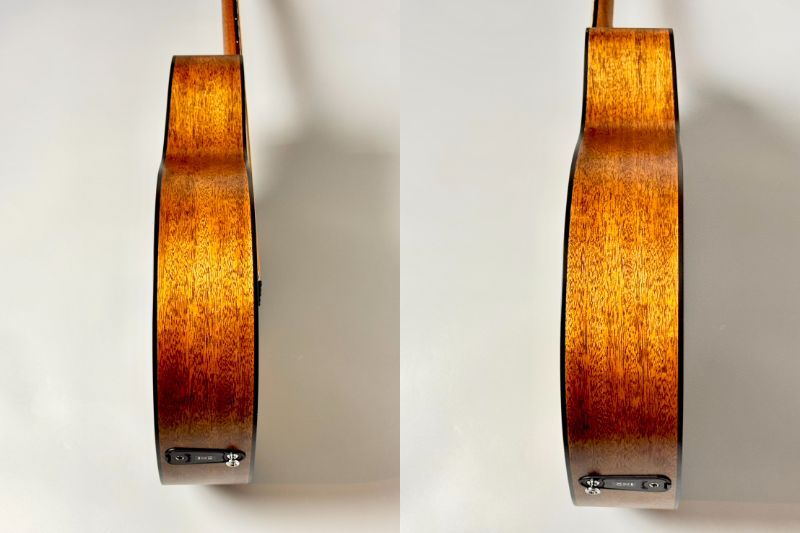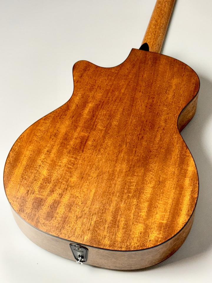 トップ、サイド&バックにはマホガニーを採用。マホガニー特有のウォームでまとまりのあるトーンが特徴で、立ち上がりが良く、コードストロークでは芯のある響きを、フィンガースタイルでは音の粒立ちとニュアンスの表現力を発揮します。バンドアンサンブルの中でも埋もれにくく、歌モノの伴奏にも相性の良いサウンドキャラクターです。